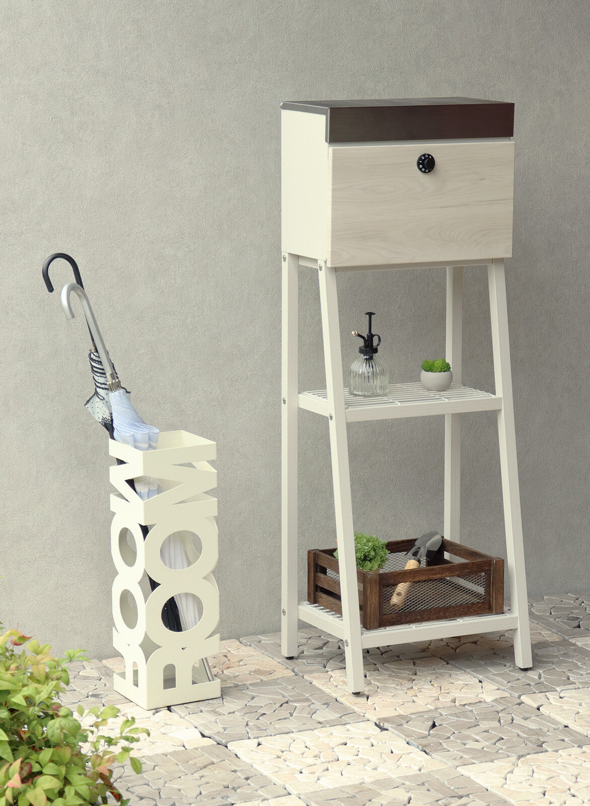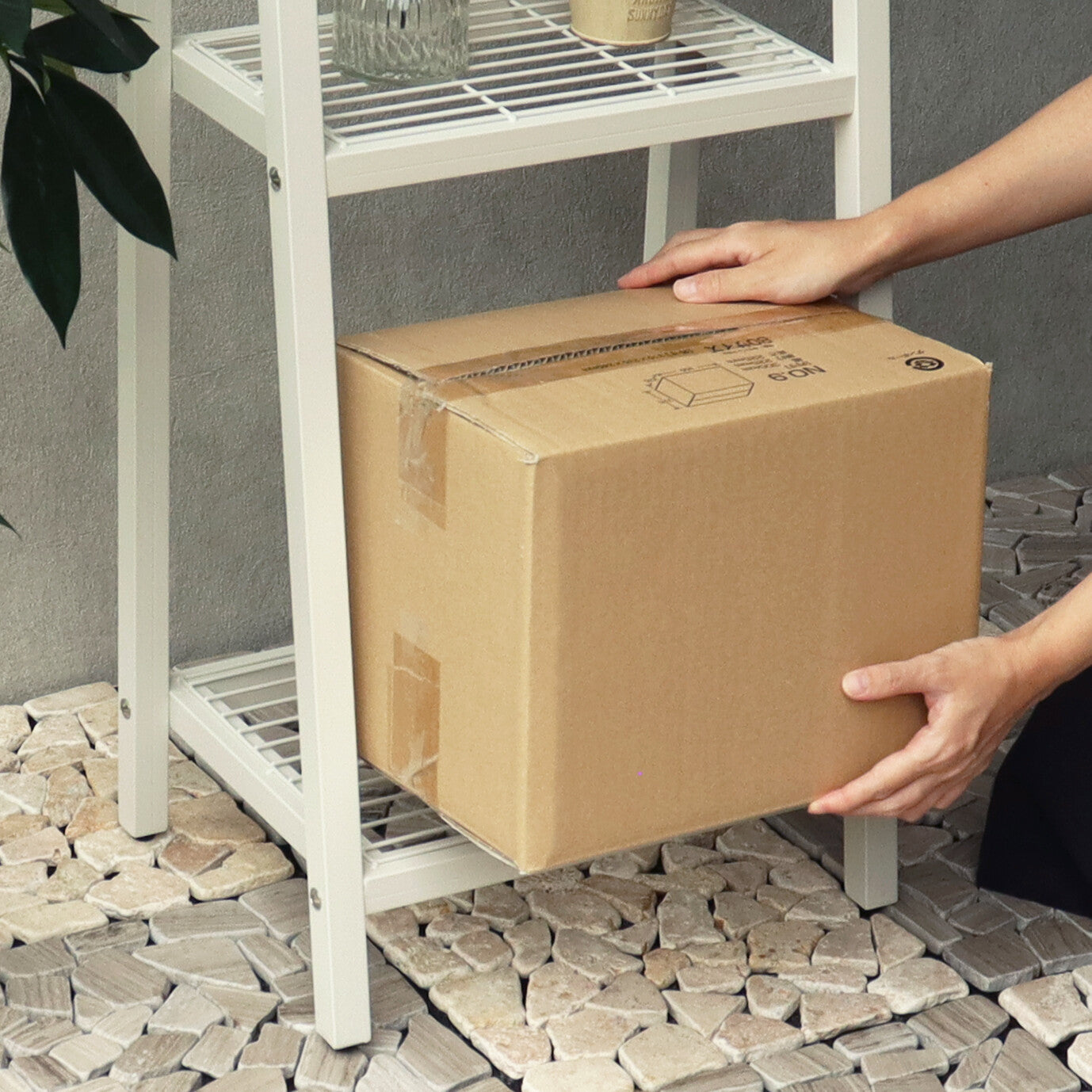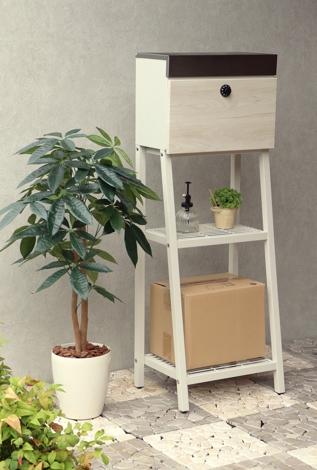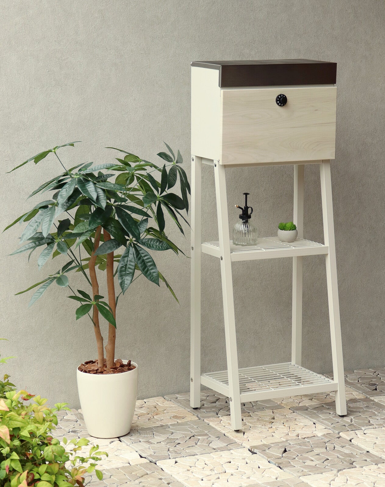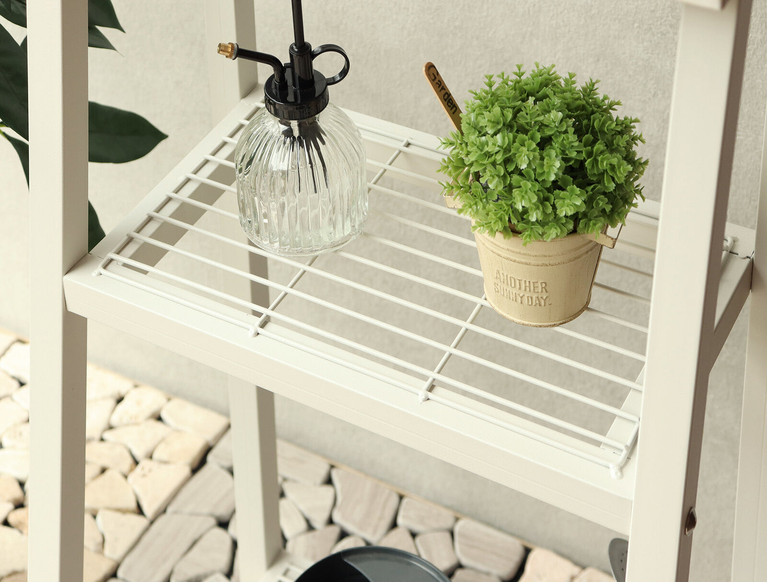 ◍脚部はアジャスター付で、アジャスターの高さ調整で、設置場所のがたつき防止の役目を果たします。棚板付きタイプで、小さな荷物であれば、棚板を置き配用としてご使用いただけます。棚板が2枚付きで、小物の装飾やガーデニングアイテムの収納として便利にご使用いただけます。