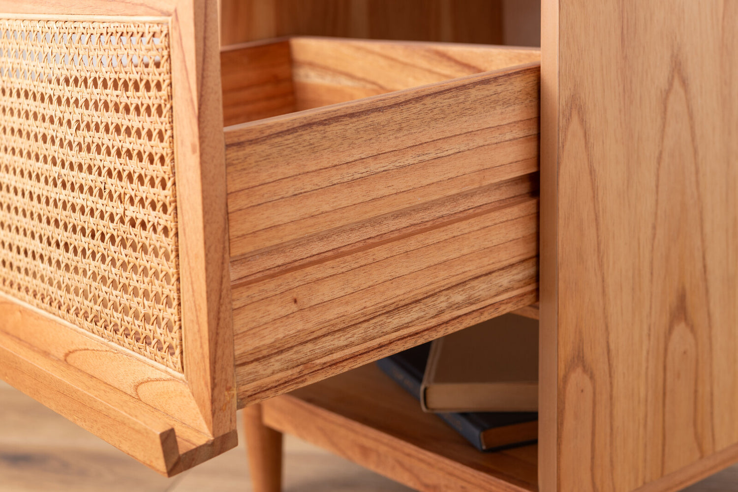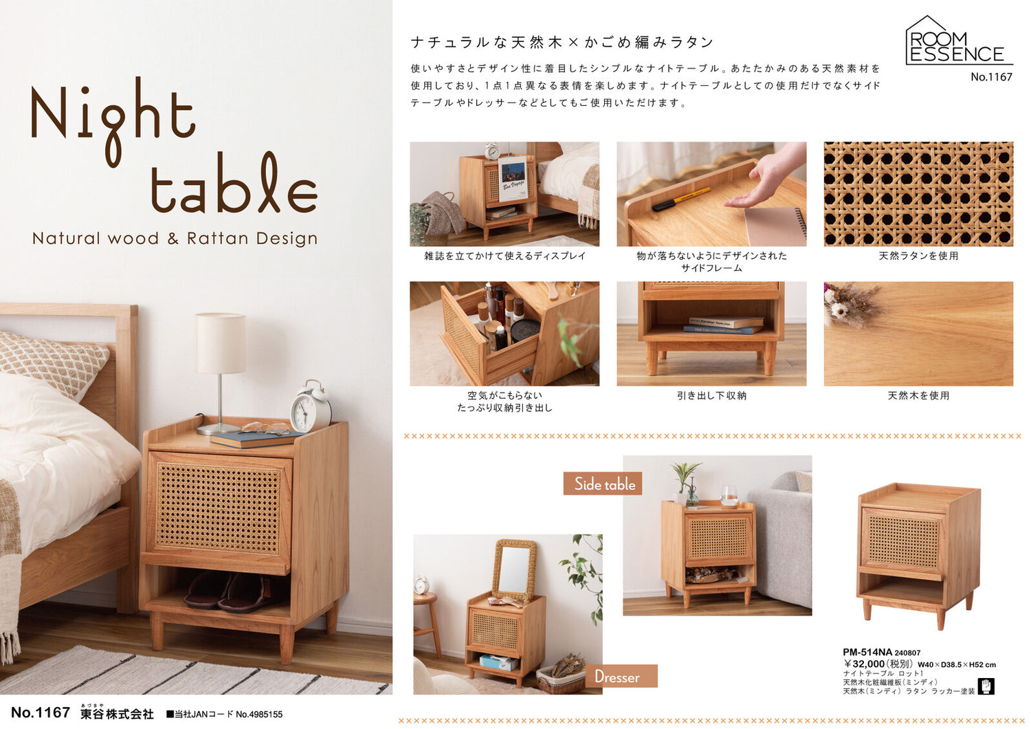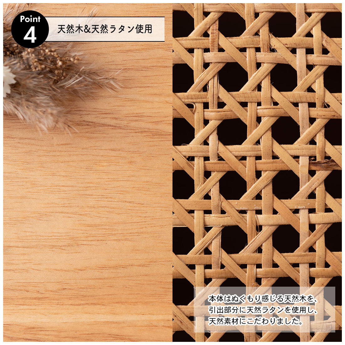 ま本体はぬくもり感じる天然木を。引き出し部分には天然ラタンを使用し、天然素材にこだわったテーブル(天然素材の為、1点1点個体差が有ります)