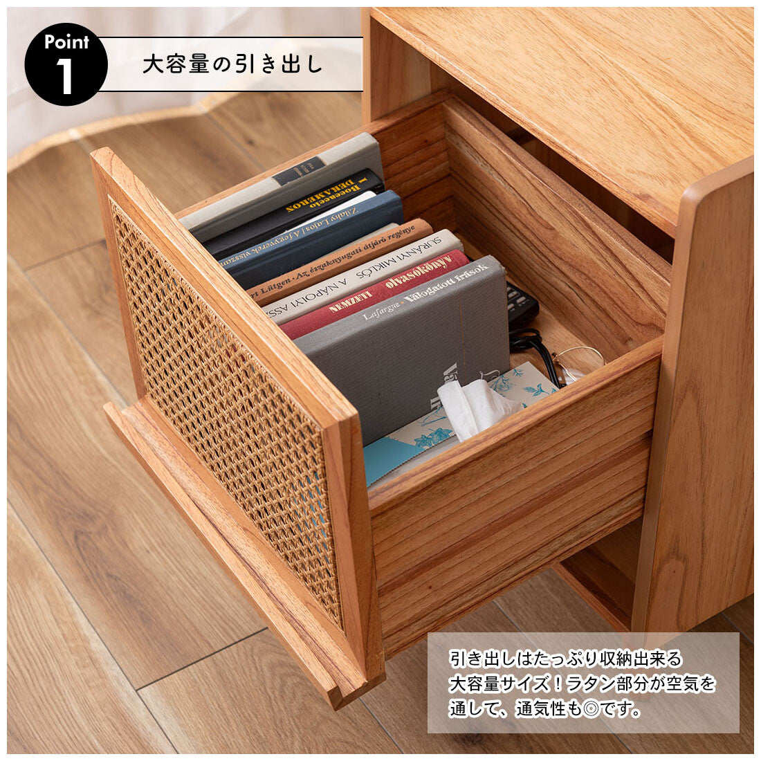 ◍引き出しはたっぷり収納できる大容量サイズ。
