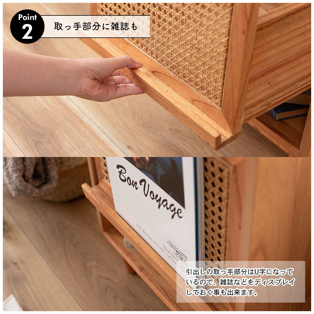◍引き出しの取っ手部分はU字になっているので、雑誌などのディスプレイにも。
