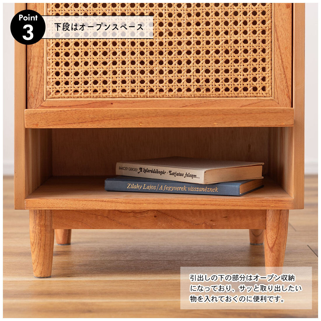◍引き出しの下部分はオープン収納になってり、サッと取り出したい物を入れておくのに便利。