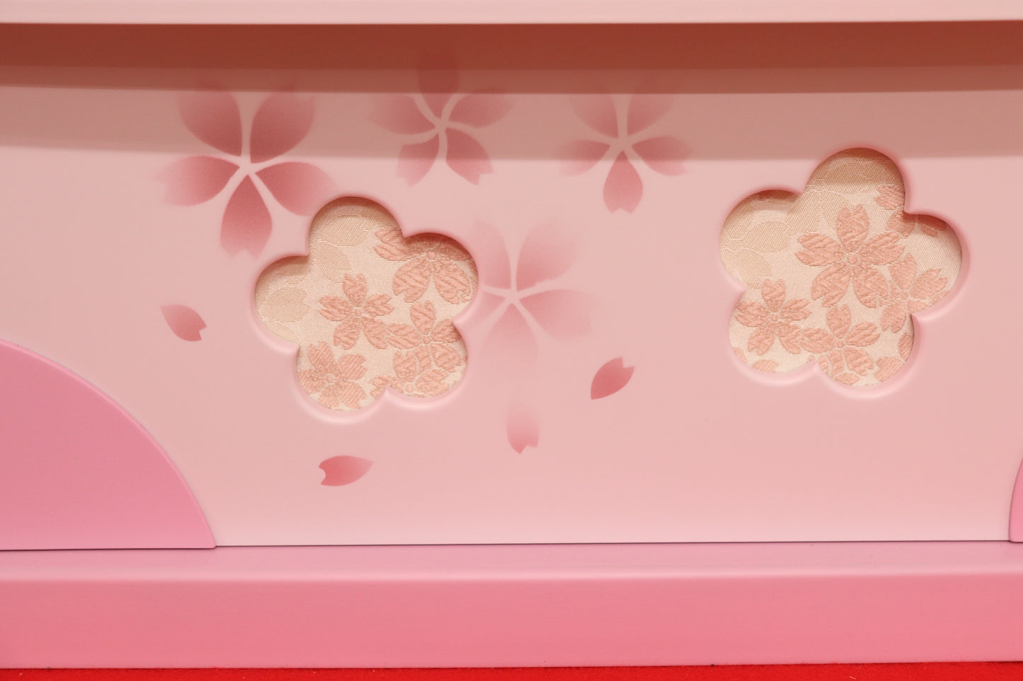 ピンク色の飾り台、屏風がとてもあかるく、可愛らしいお雛様セットです。