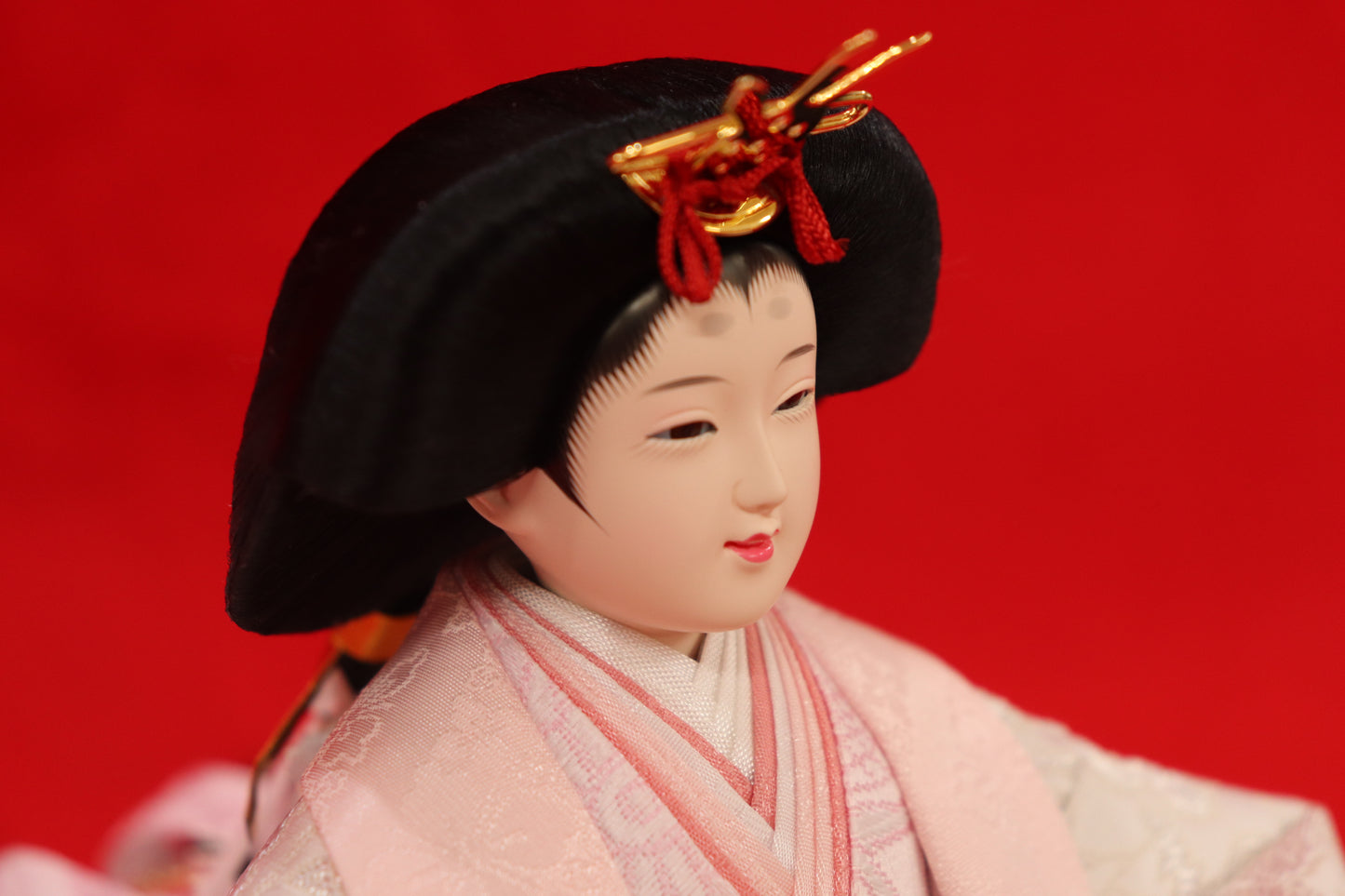 親王(お雛様、お内裏様)の淡い色の衣装が大変上品で、三人官女のお揃いのピンク色、御籠、御車、重箱もピンク色で統一され、桃の節句によく合うお色のセットです。