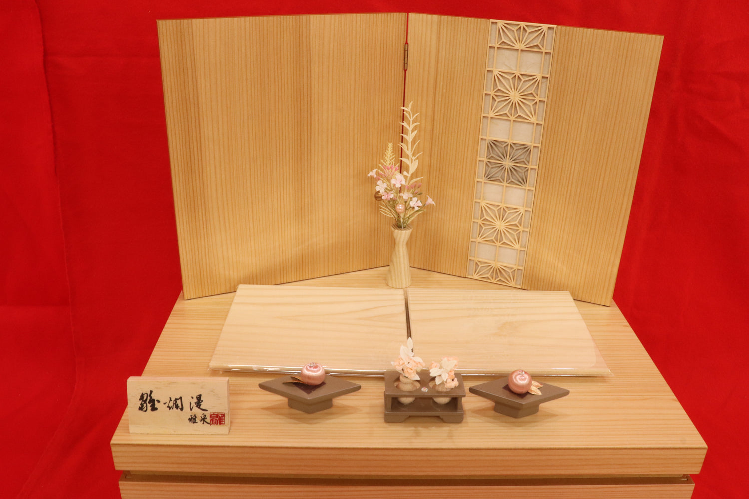 白木の飾り台、屏風に細工が施され上品さが感じられます。
