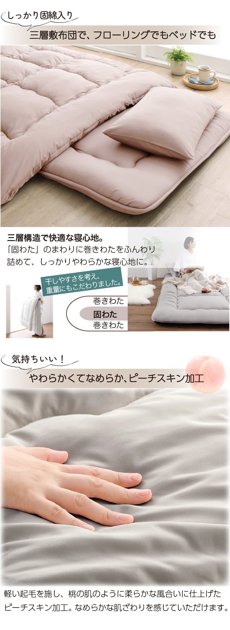 ※お洗濯の際はそれぞれの品質表示を必ずご確認ください。しっかり固綿入り 三層敷布団で、フローリングでもベッドでも!!