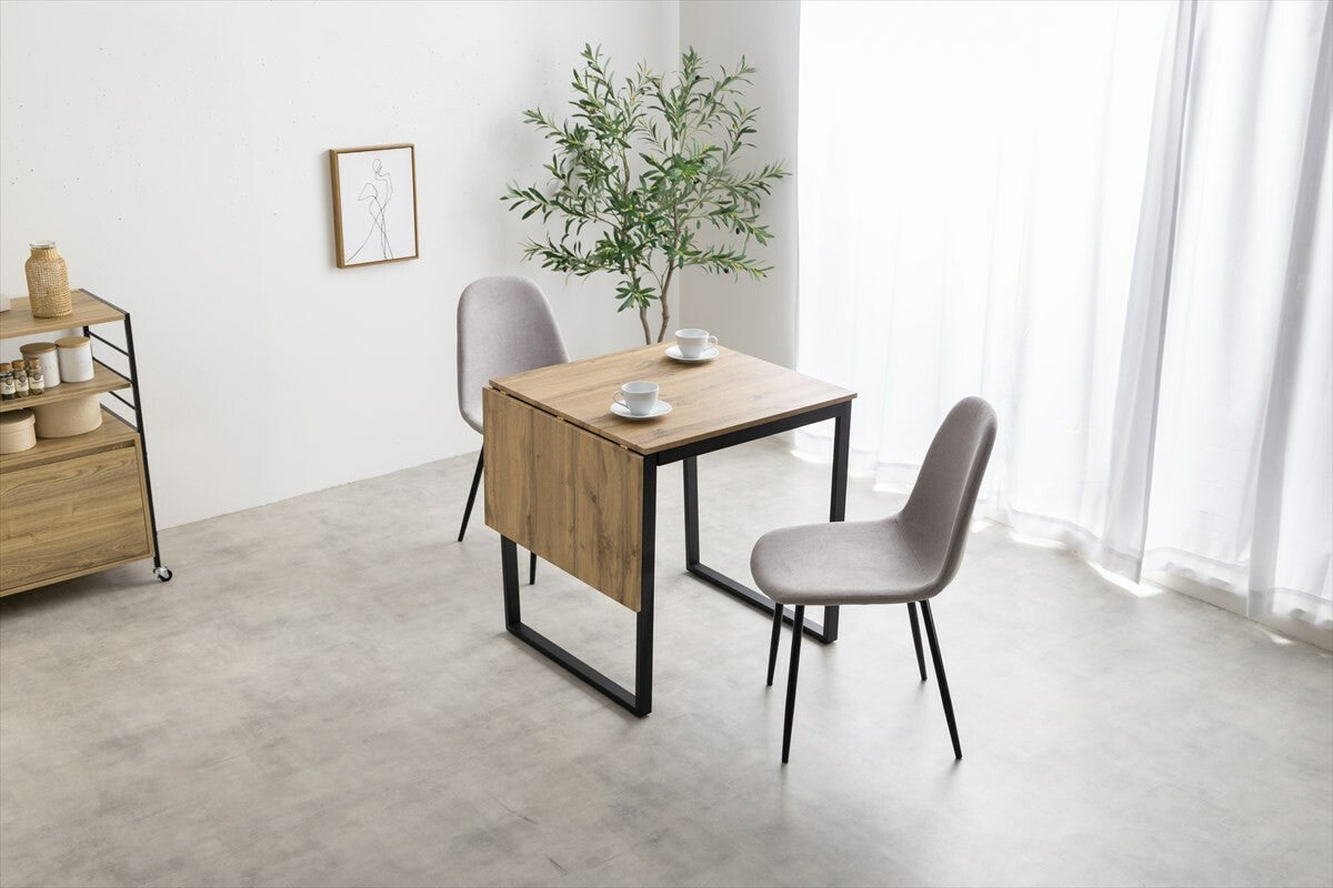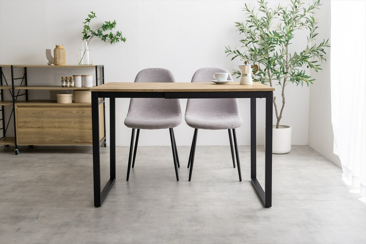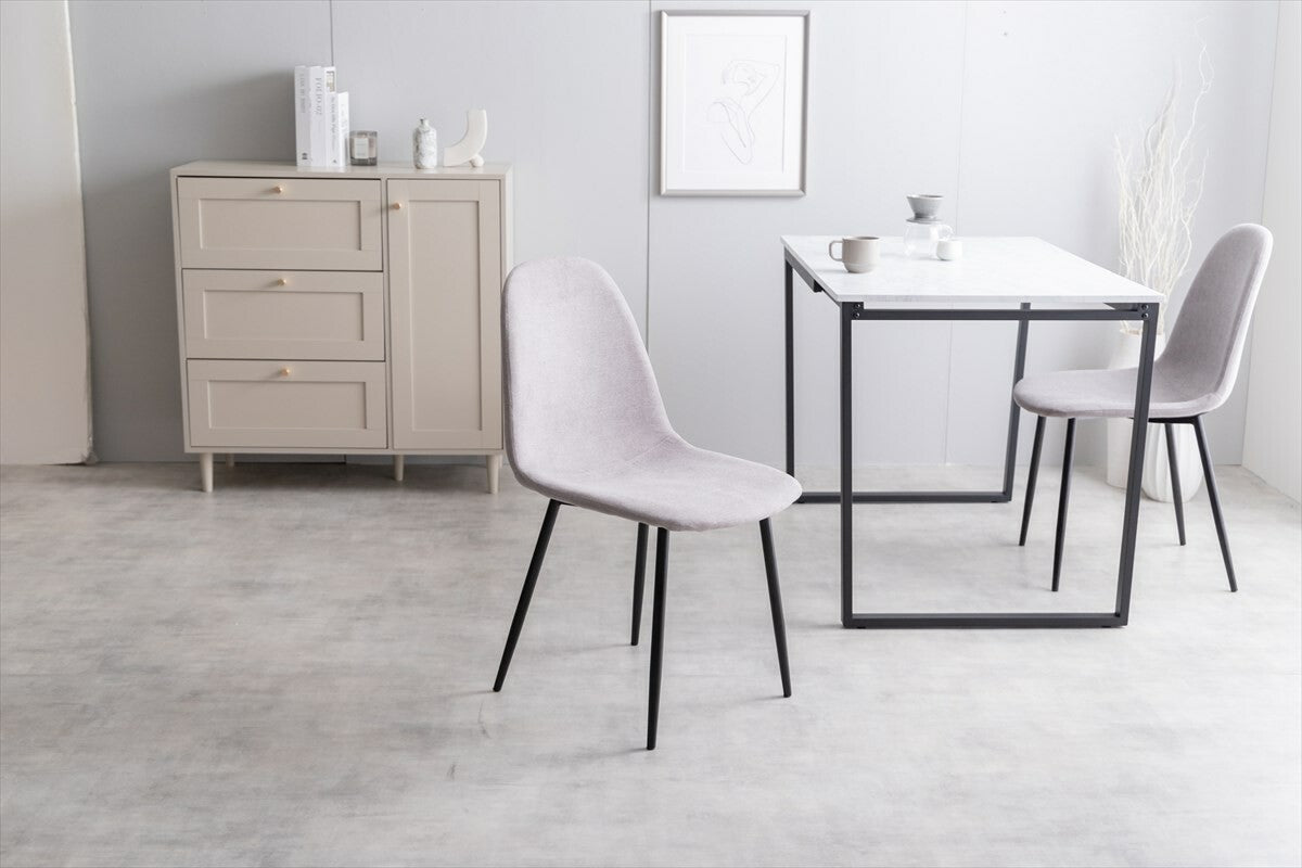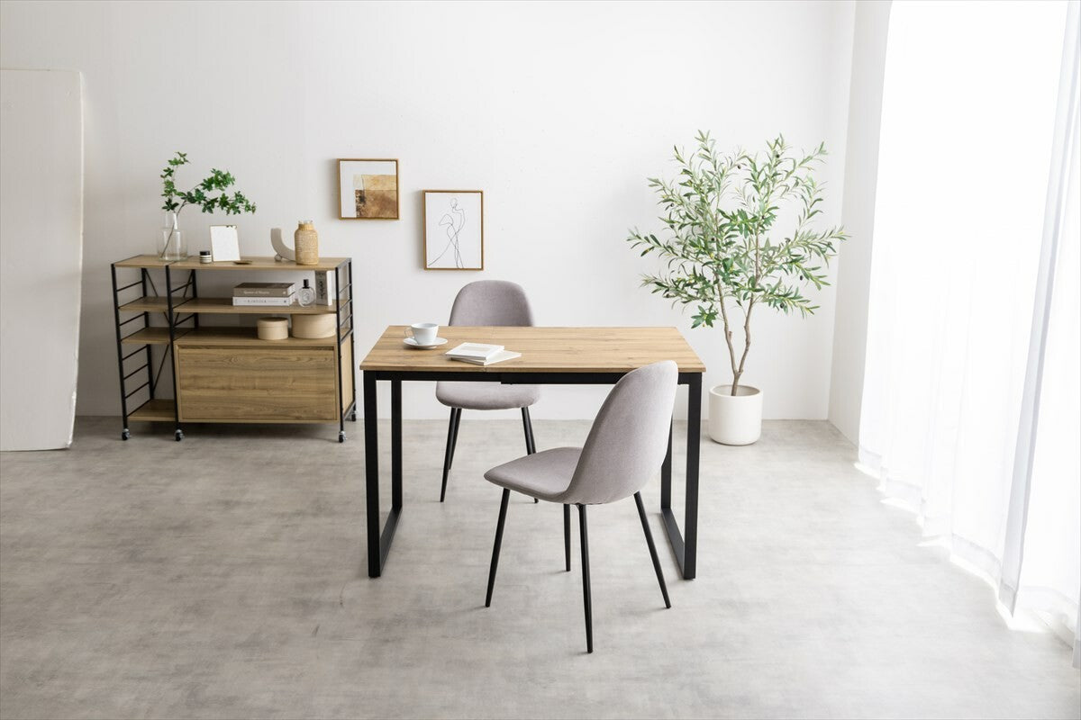 ◍2脚のチェアはテーブルと調和するファブリック生地を使用し、程よく弾力のあるウレタンフォームを採用した座面と背もたれは長時間座っても疲れにくい設計。