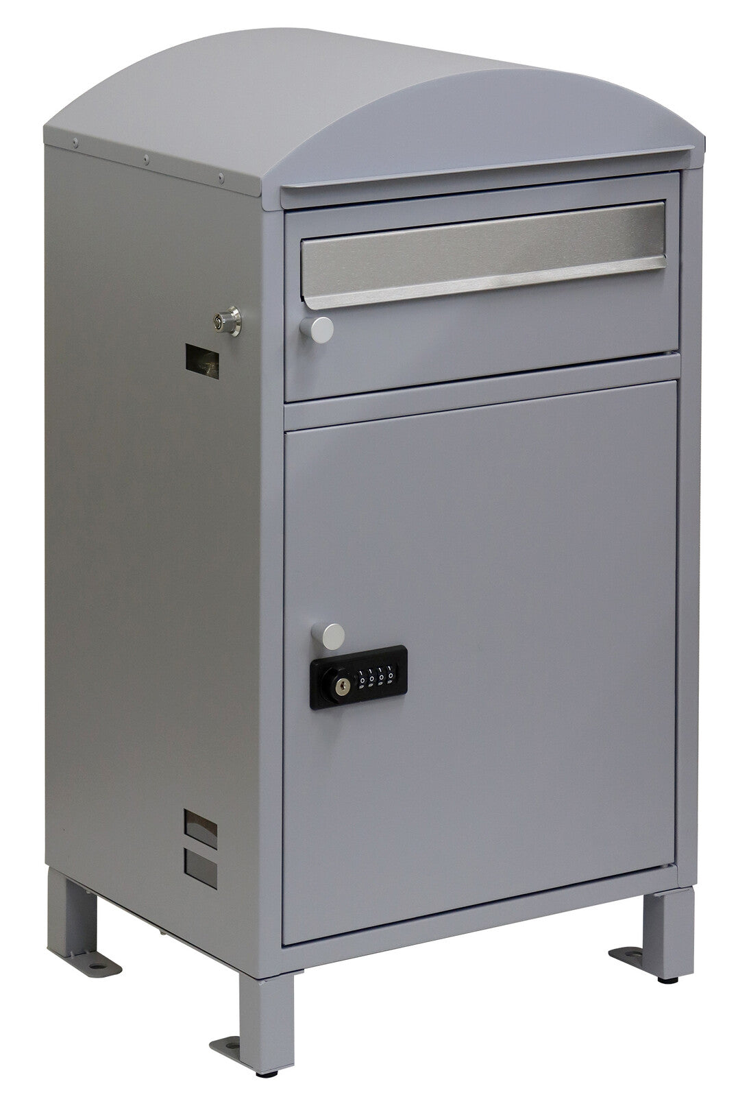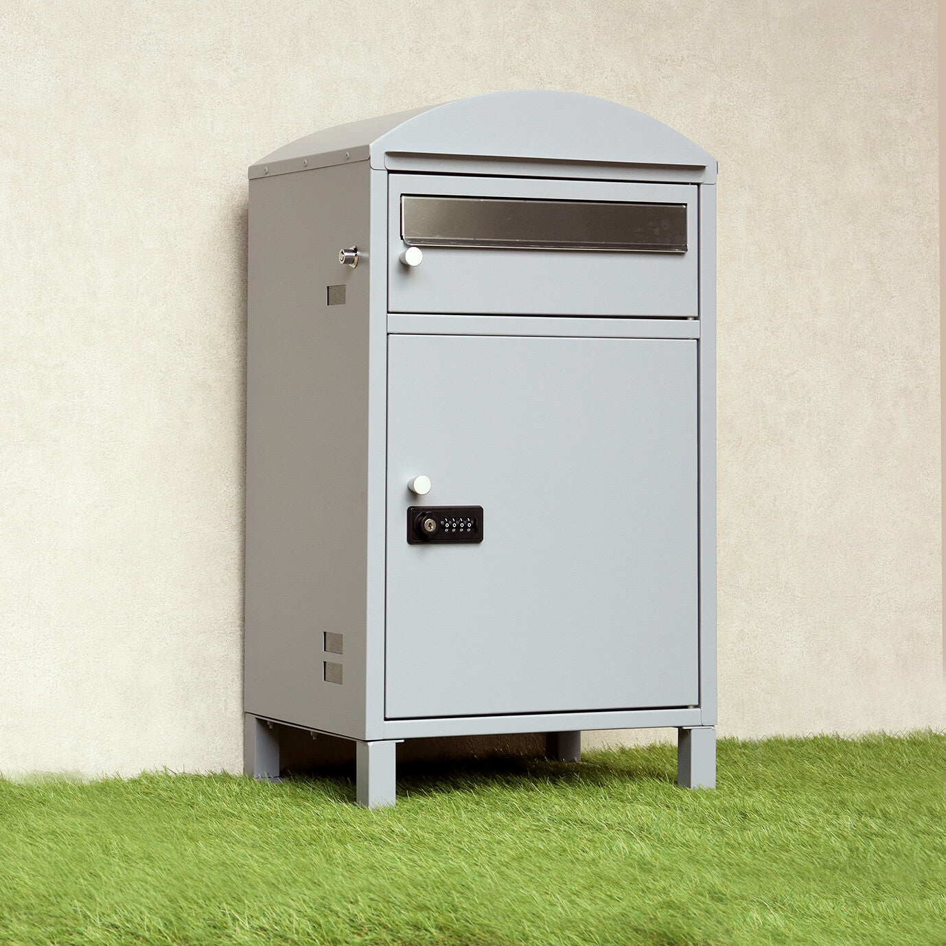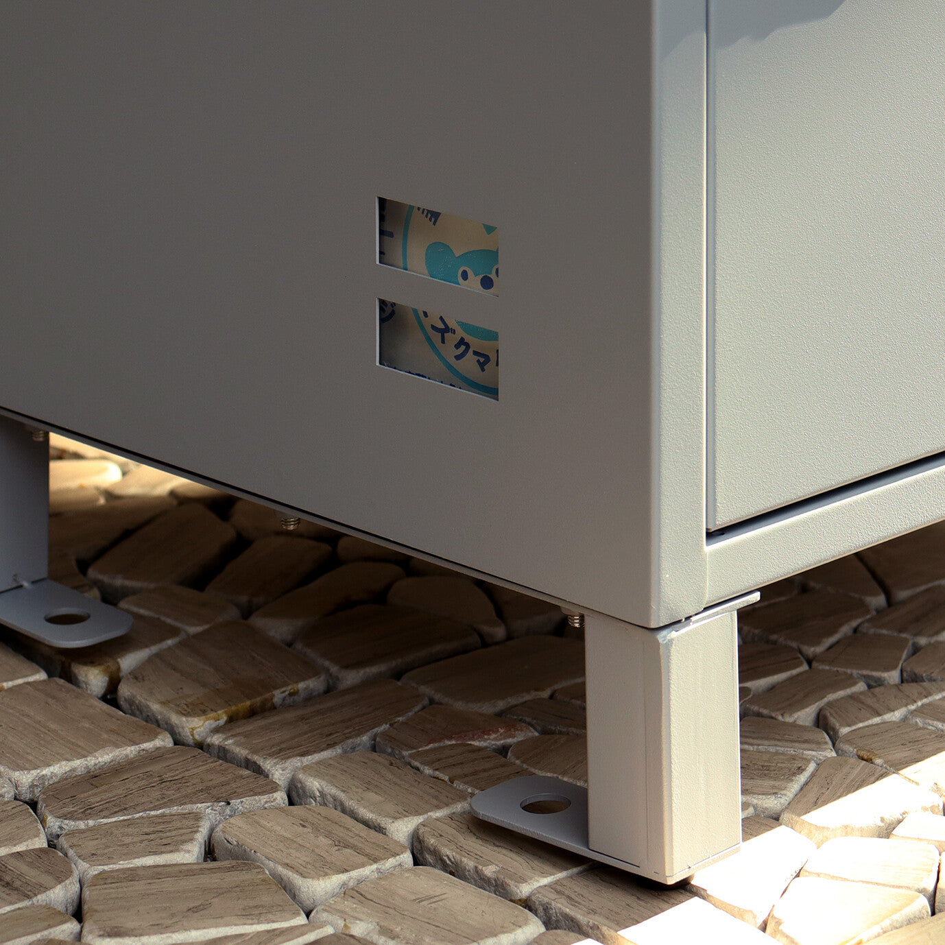ガルバナイズド処理を施しているため、錆びの発生がしにくい仕様となっております。扉の取っ手はシルバーカラーの丸みのある取っ手を使用し、ワンポイントのデザインのアクセントとなっております。印鑑ケースは2個付属しており、上段も宅配ボックスとしての使用も可能です。