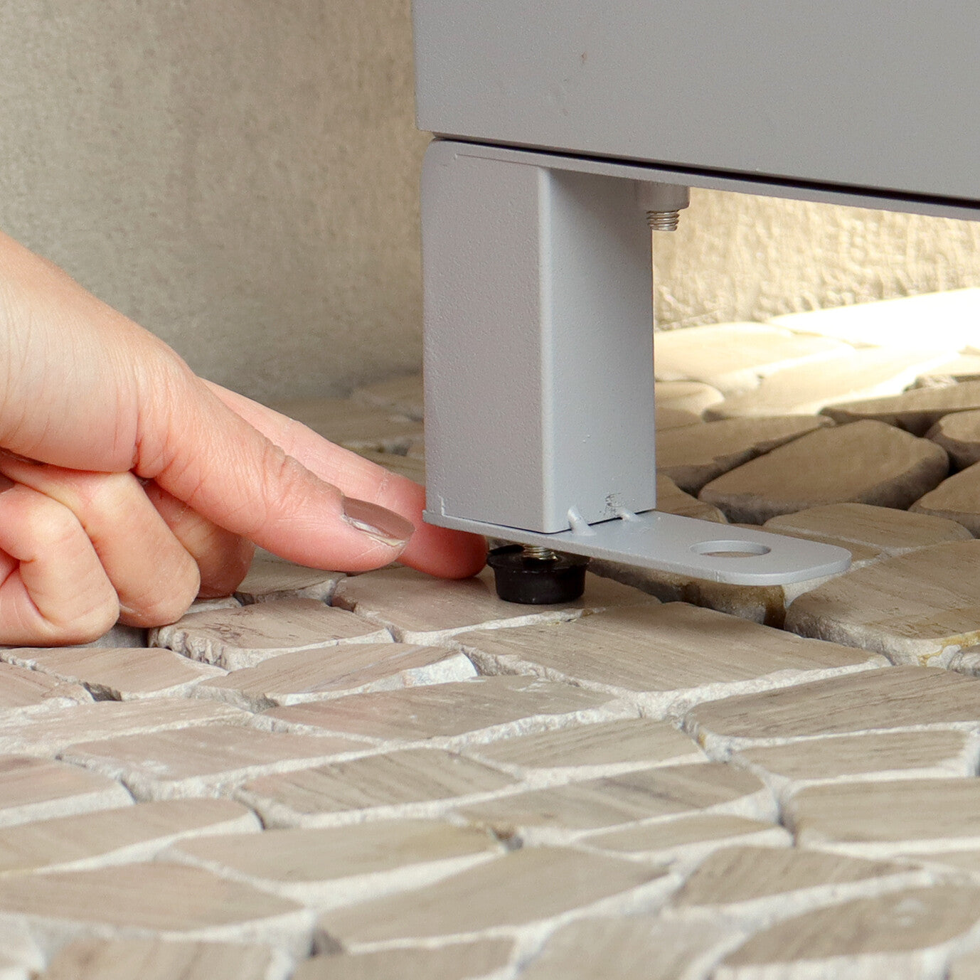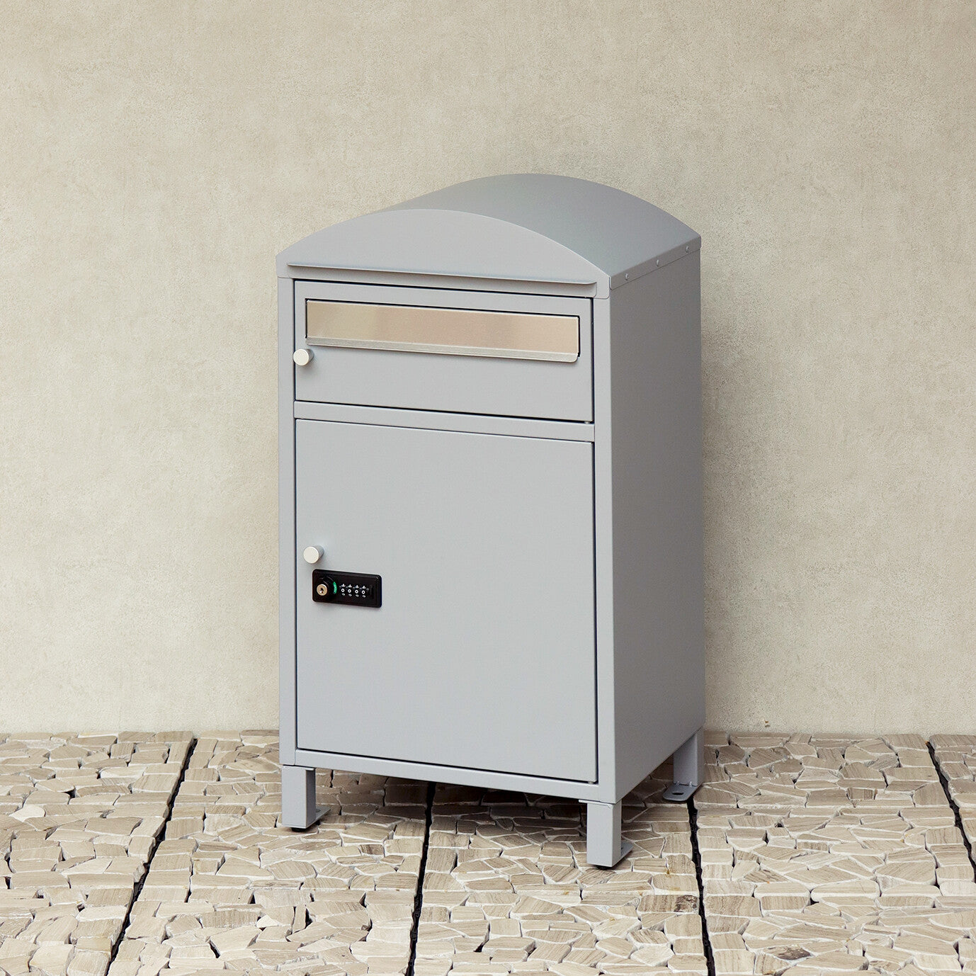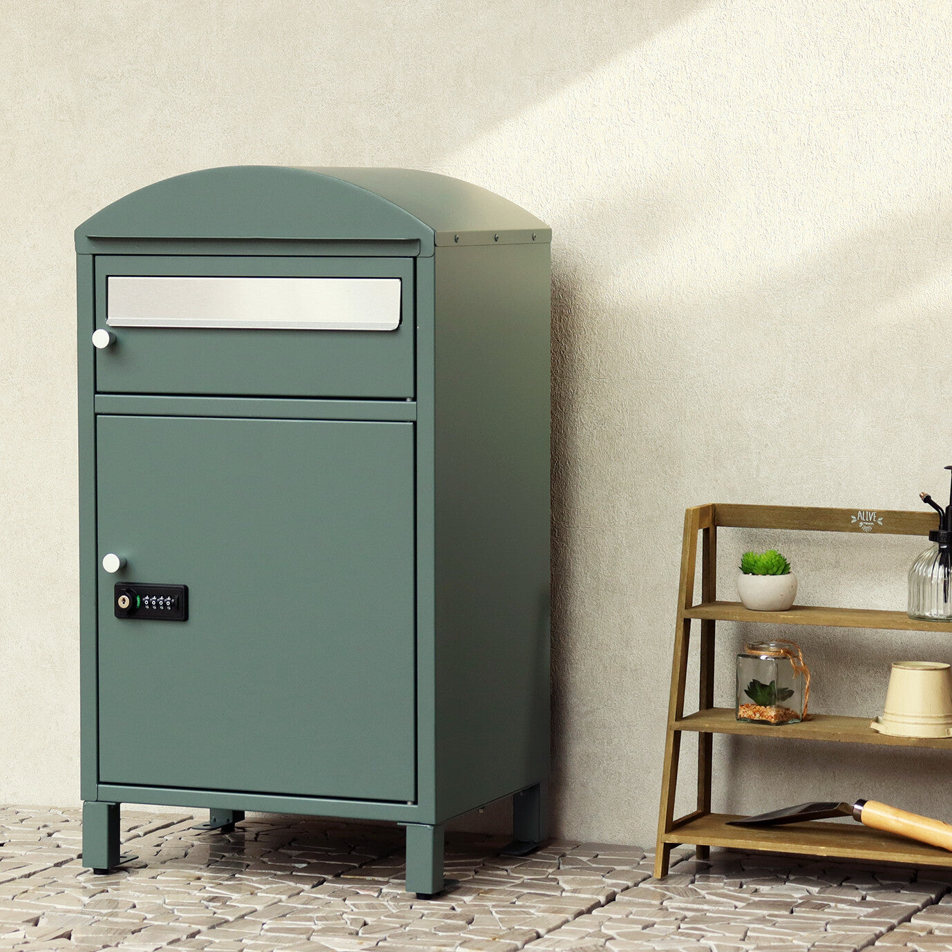ガルバナイズド処理を施しているため、錆びの発生がしにくい仕様となっております。扉の取っ手はシルバーカラーの丸みのある取っ手を使用し、ワンポイントのデザインのアクセントとなっております。印鑑ケースは2個付属しており、上段も宅配ボックスとしての使用も可能です。