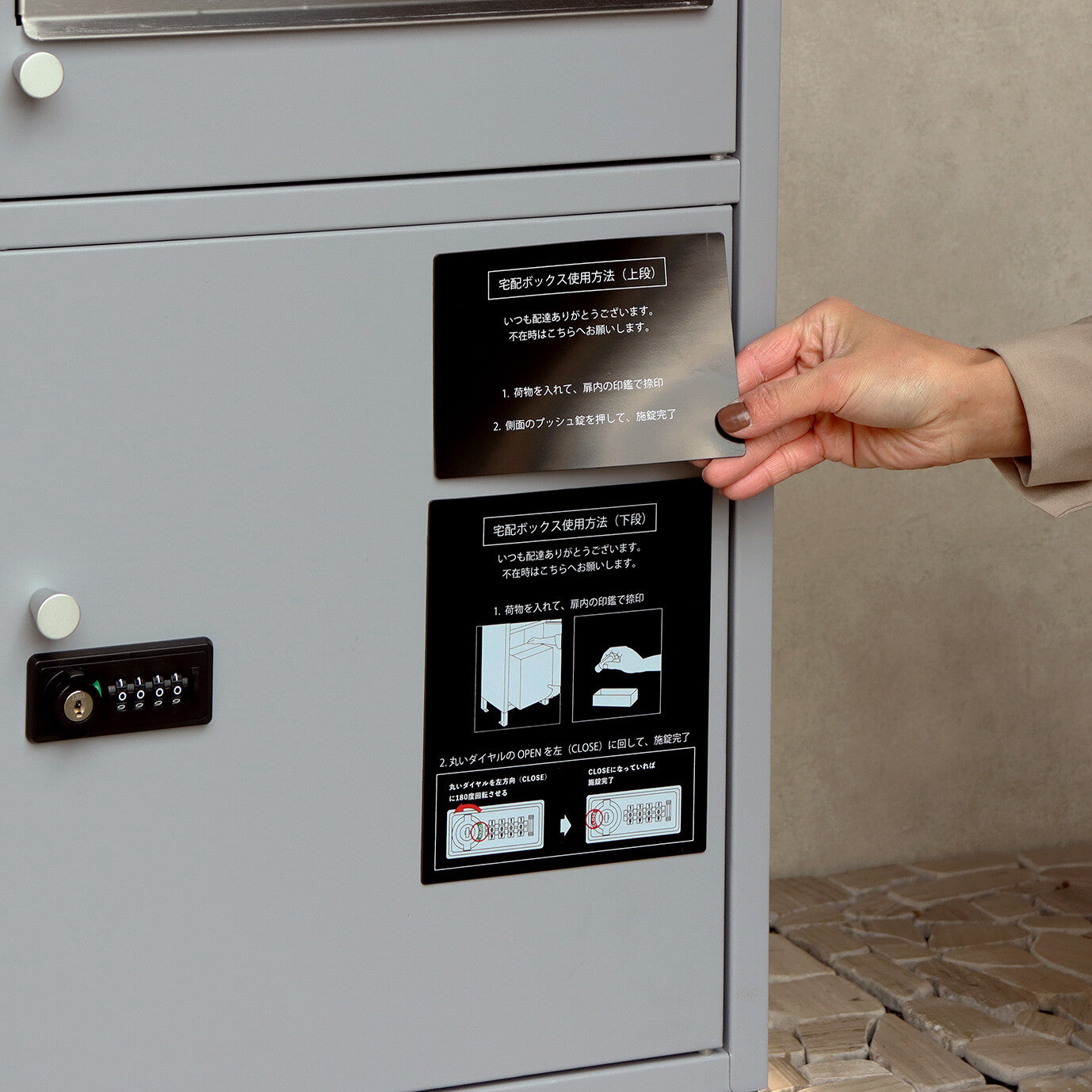 キー(上段用、下段用)、アンカーボルト、キーフック付印鑑ケース、宅配業者用の配達マニュアル(マグネット式でお好きな場所に貼付け可)が付属しており、お客様で追加でご用意頂くものは特になく、すぐにご使用頂けます。