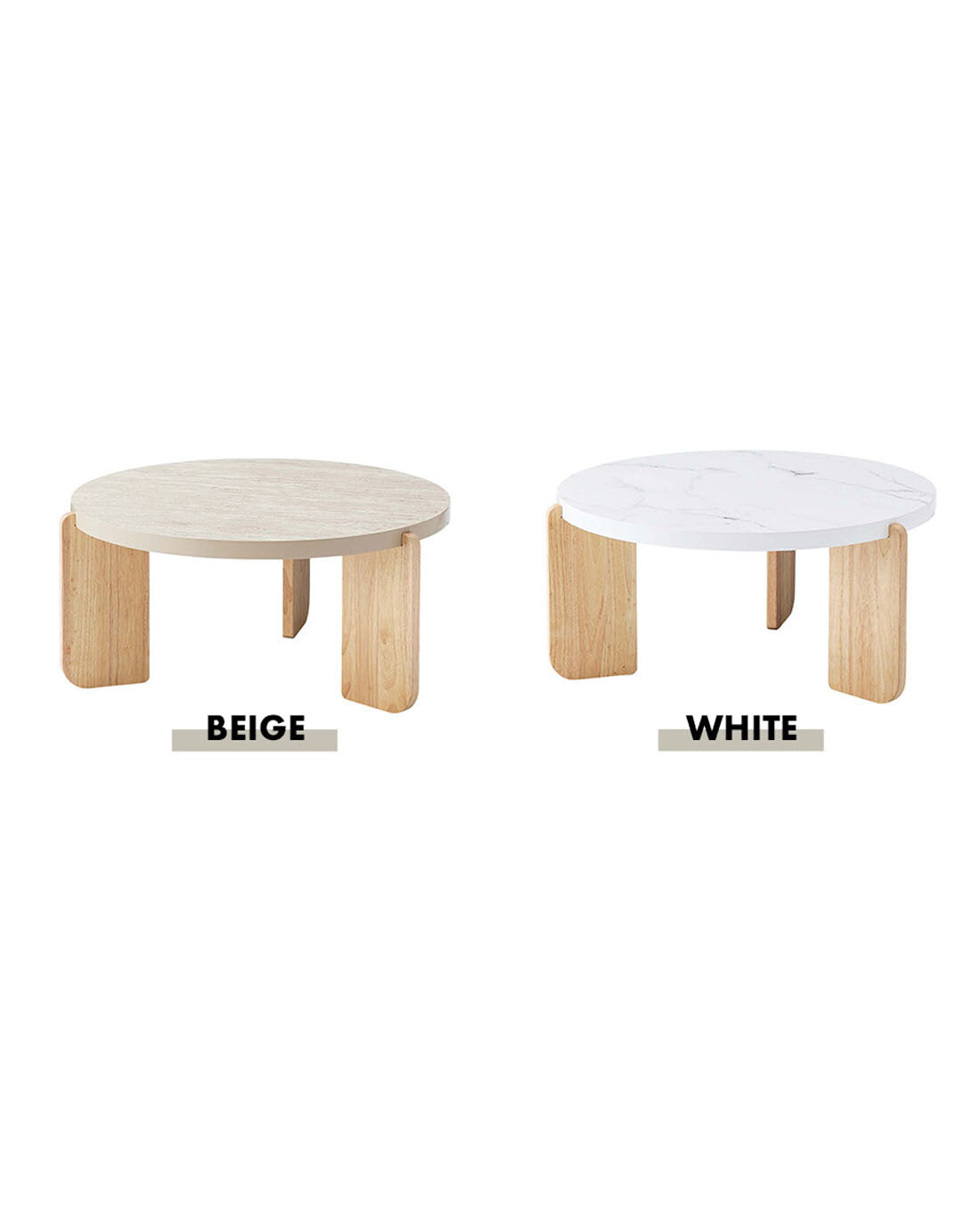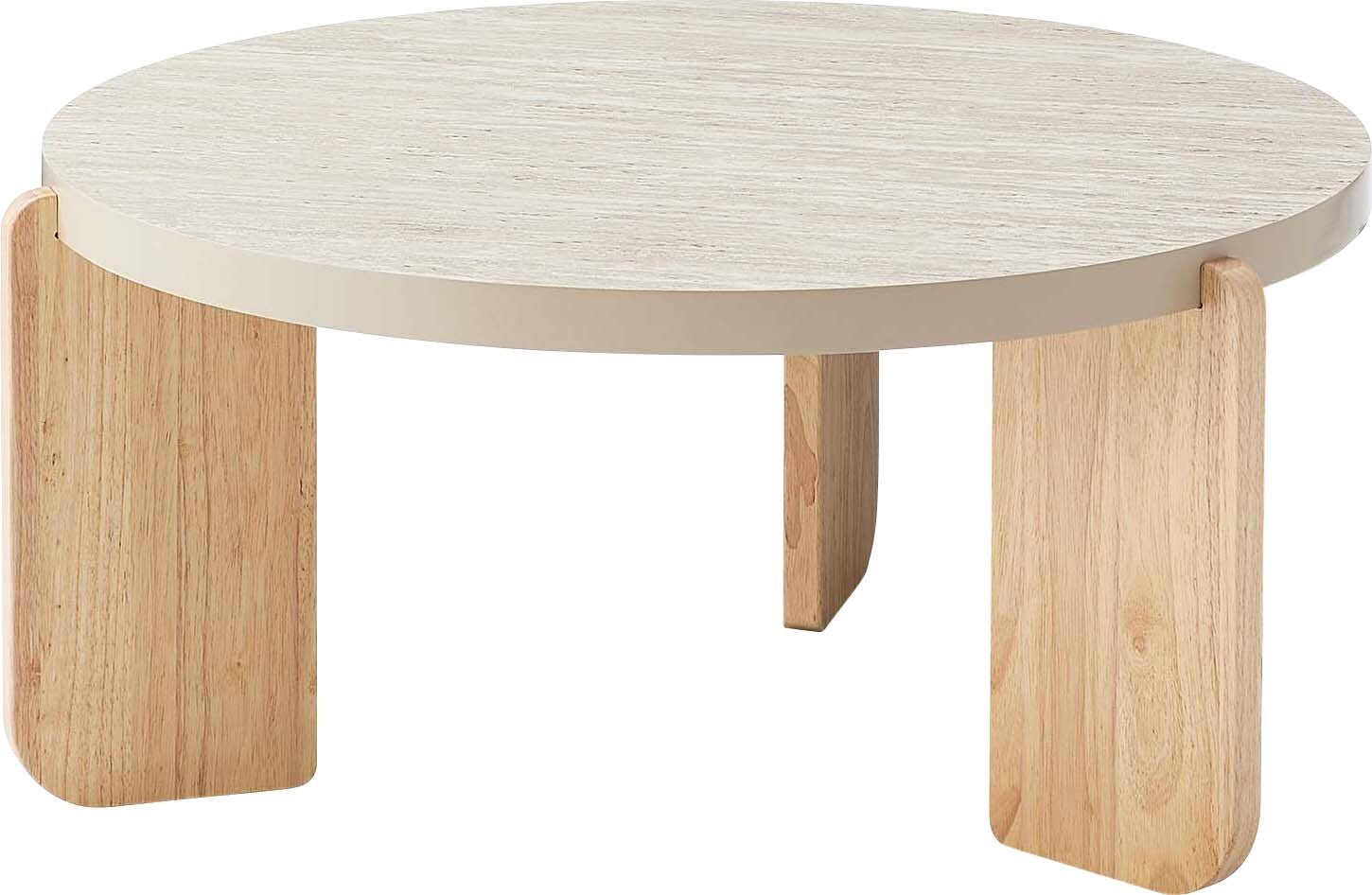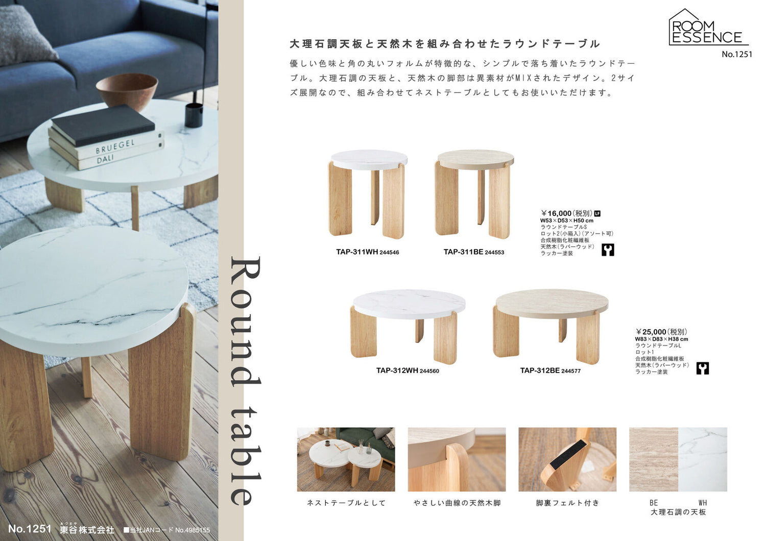 ◍大理石調天板と天然木を組み合わせたラウンドテーブル。