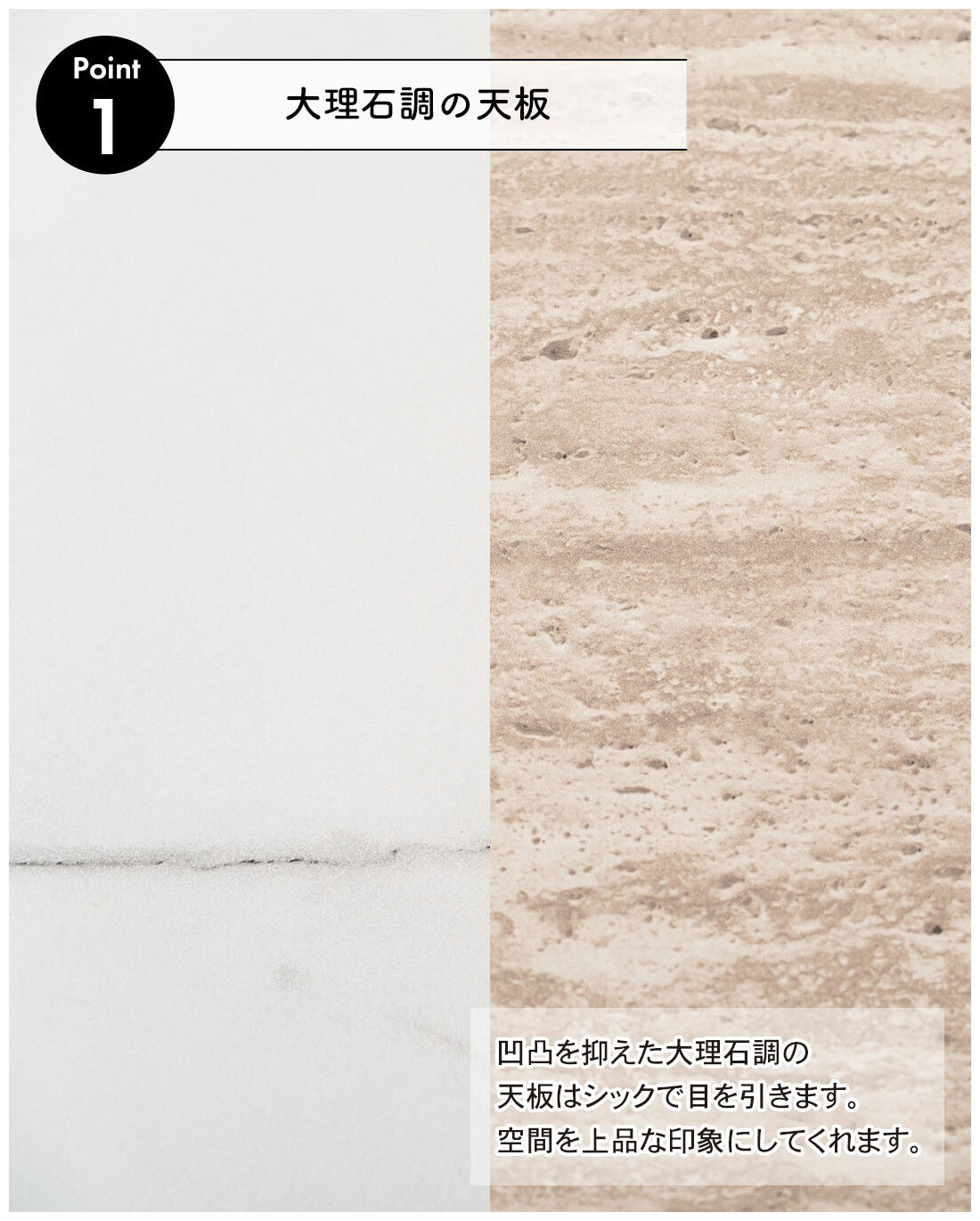 ◍凹凸を抑えた大理石調の天板はシックで目を引く上品な佇まい。