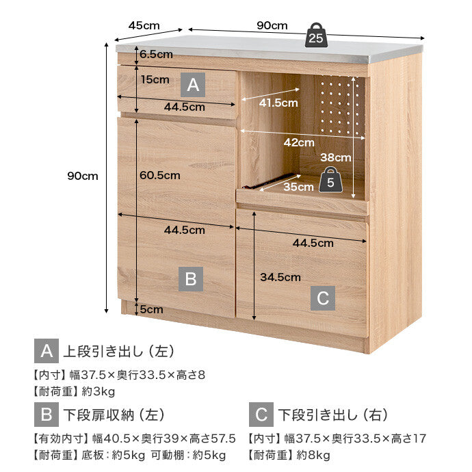 下段扉収納(底板・可動棚):約5kg、下段引き出し収納:約8kg、