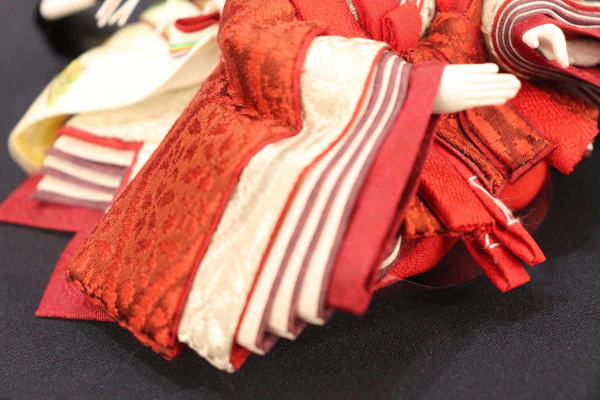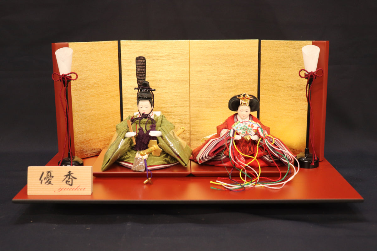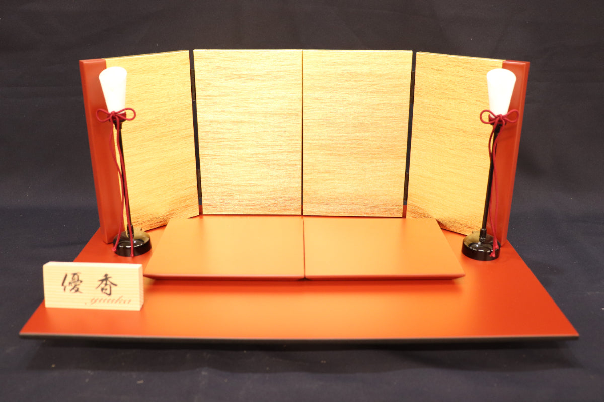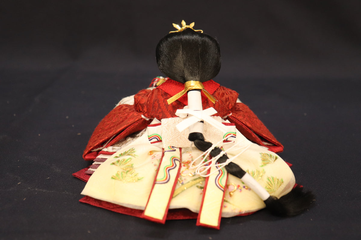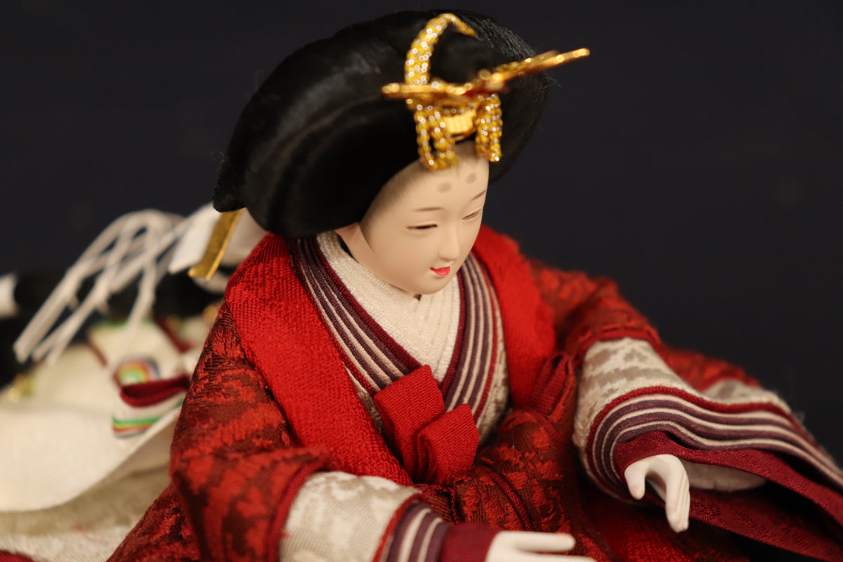 朱色の飾り台に金屏風が上品さを出しております。また、女性作家ならではの細かい衣装の細工が目を引き、お顔はとても端正で可愛らしいです。