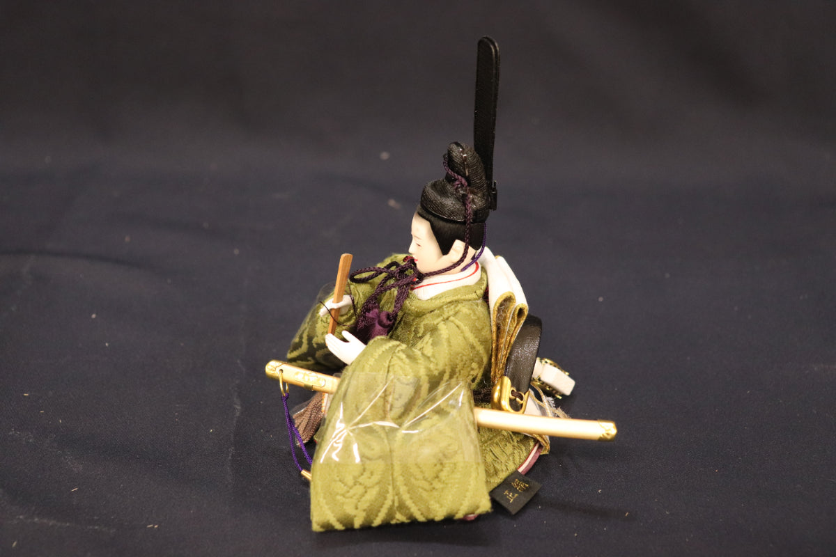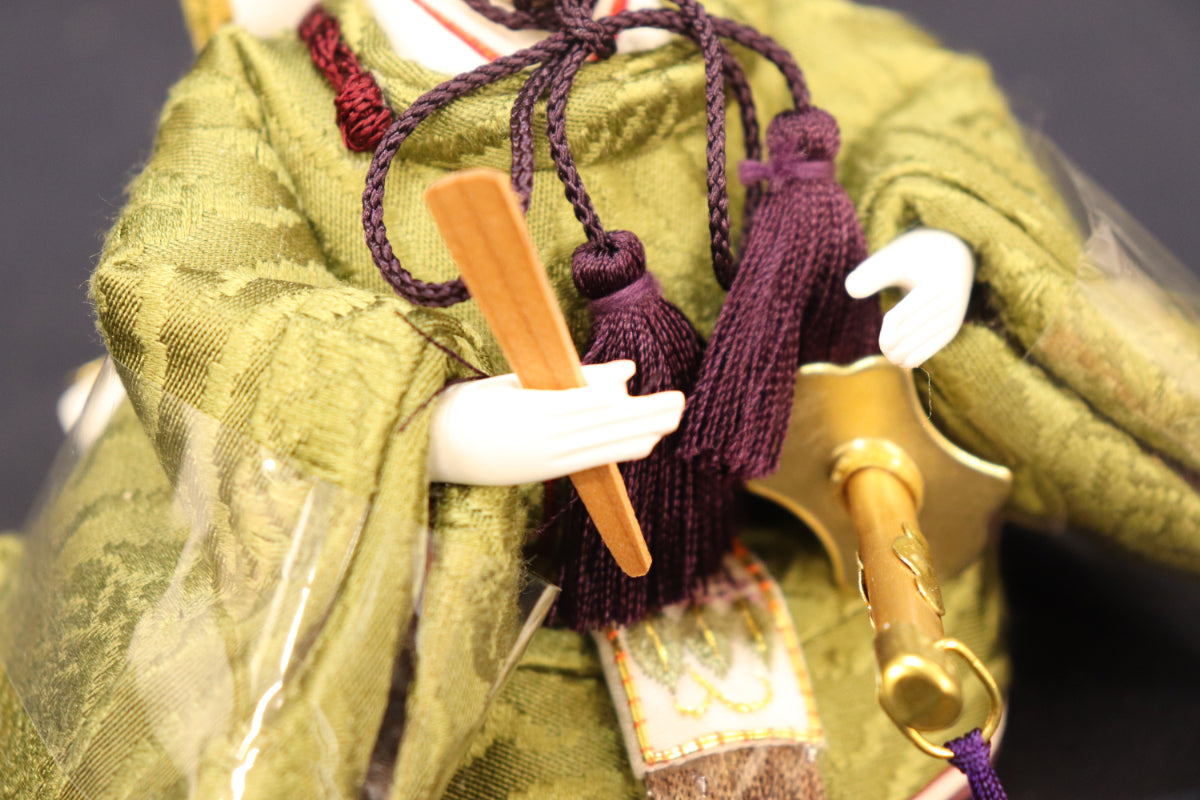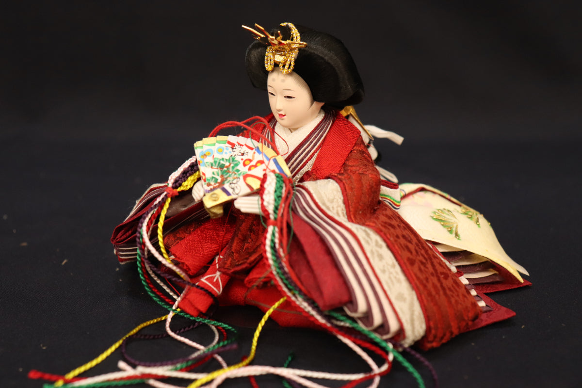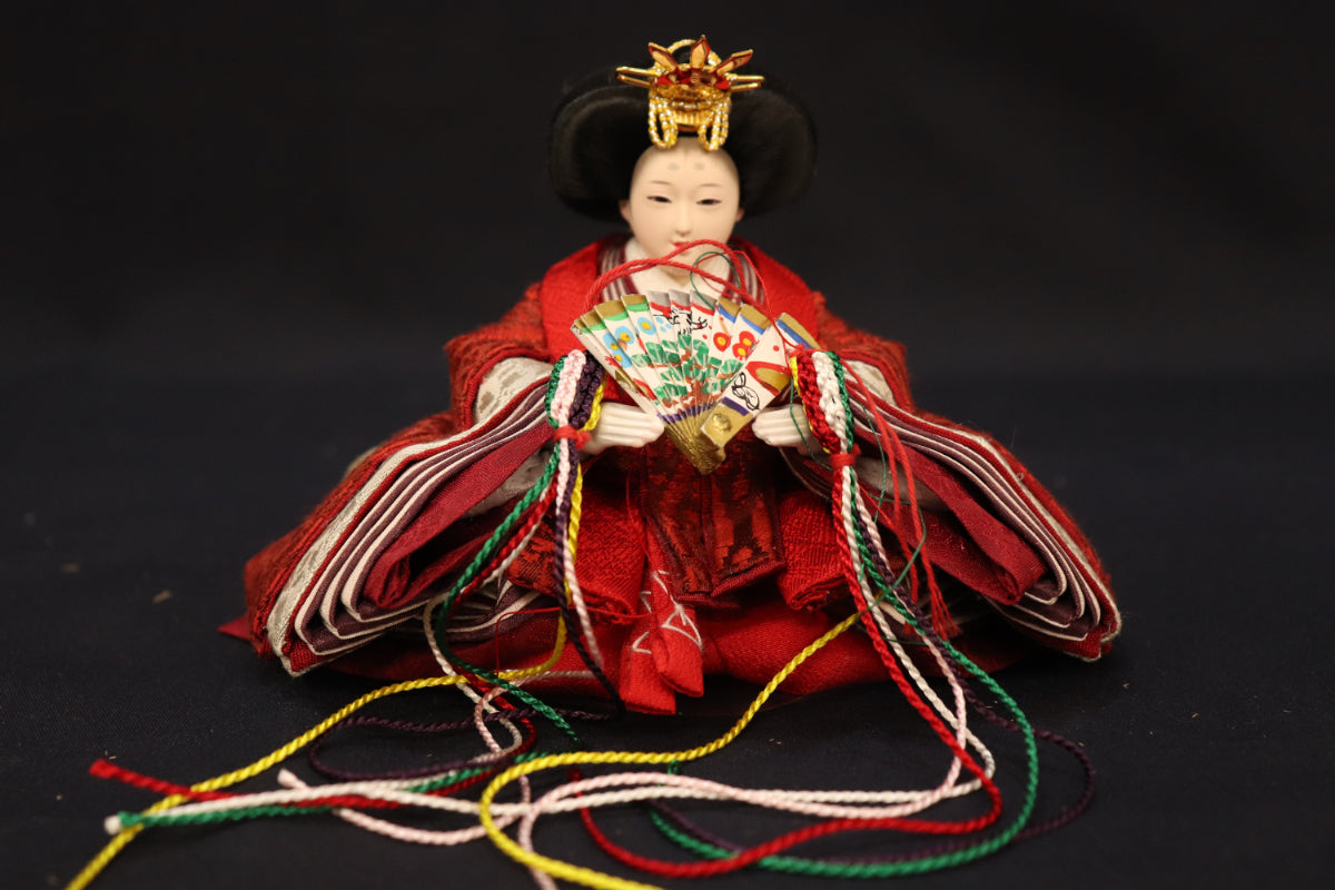 朱色の飾り台に金屏風が上品さを出しております。また、女性作家ならではの細かい衣装の細工が目を引き、お顔はとても端正で可愛らしいです。
