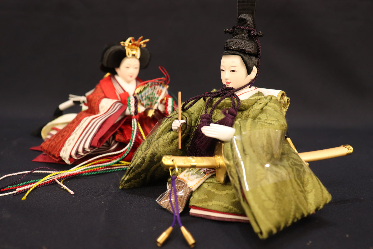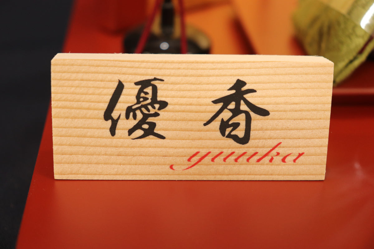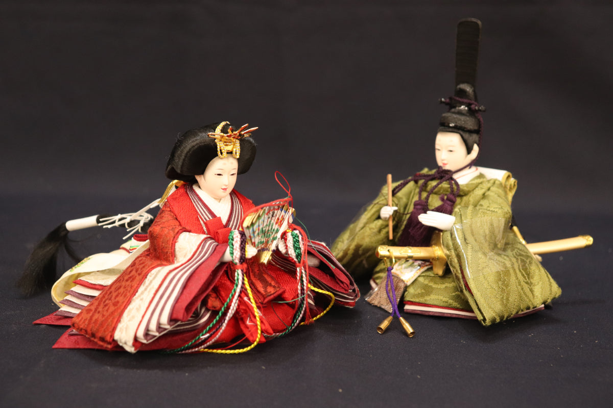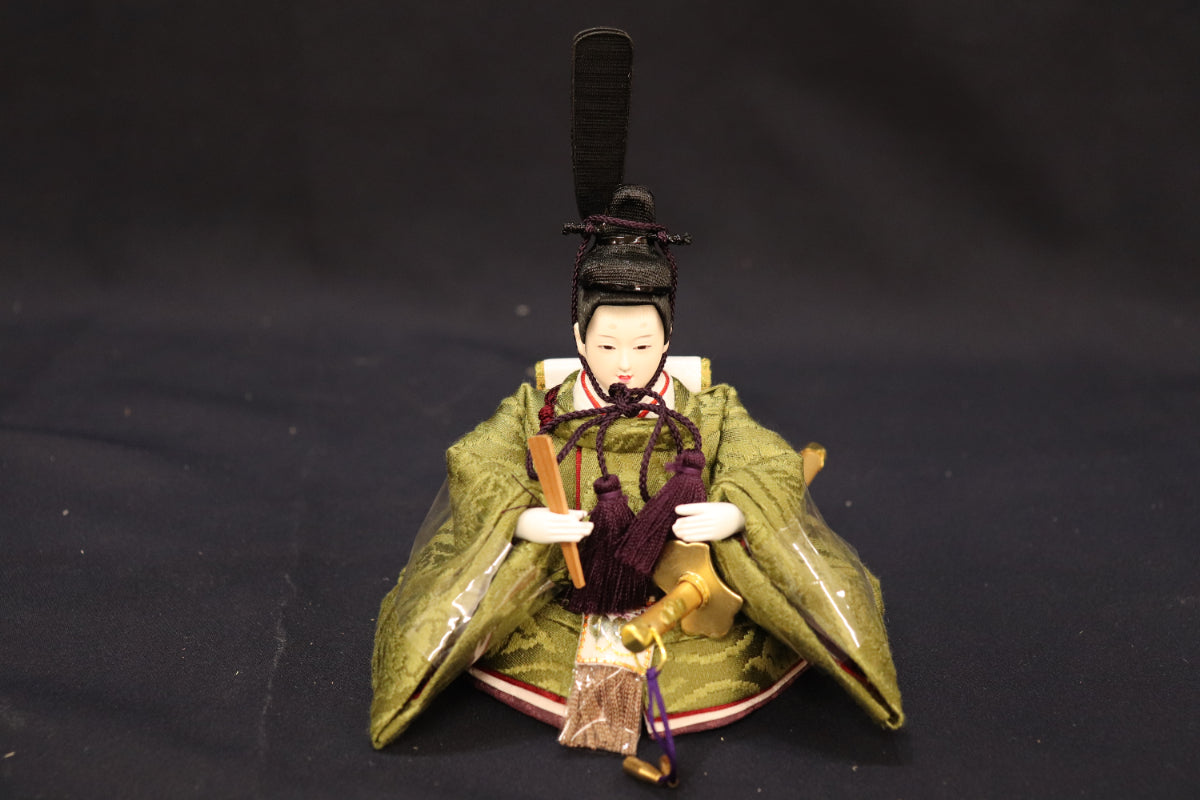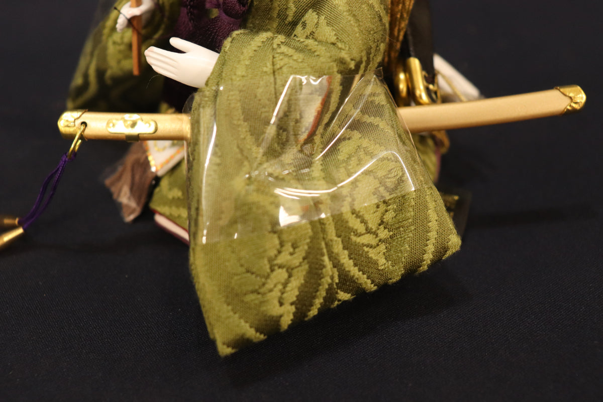 朱色の飾り台に金屏風が上品さを出しております。また、女性作家ならではの細かい衣装の細工が目を引き、お顔はとても端正で可愛らしいです。