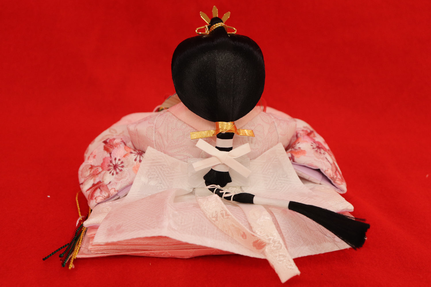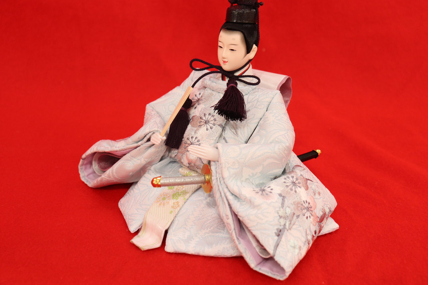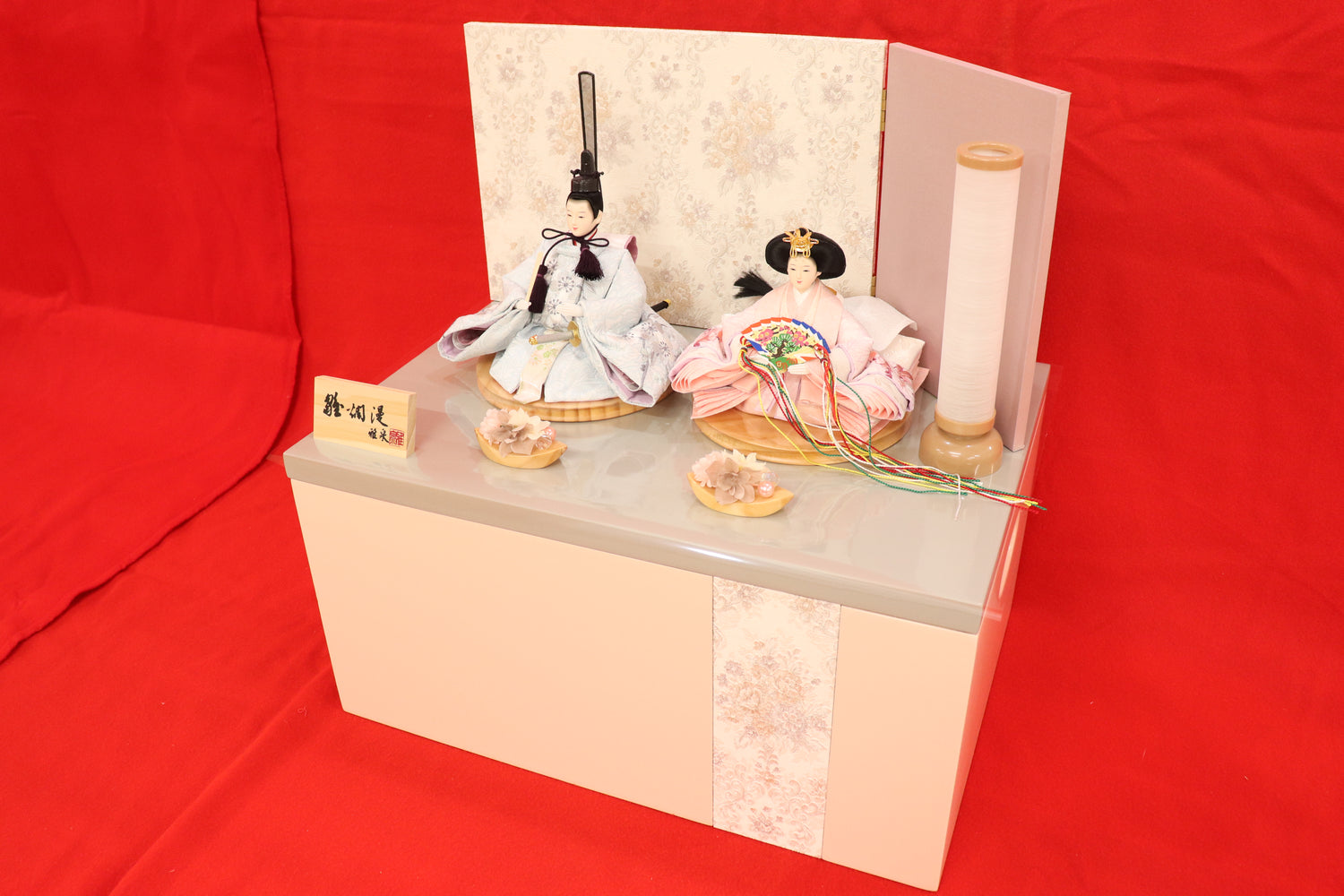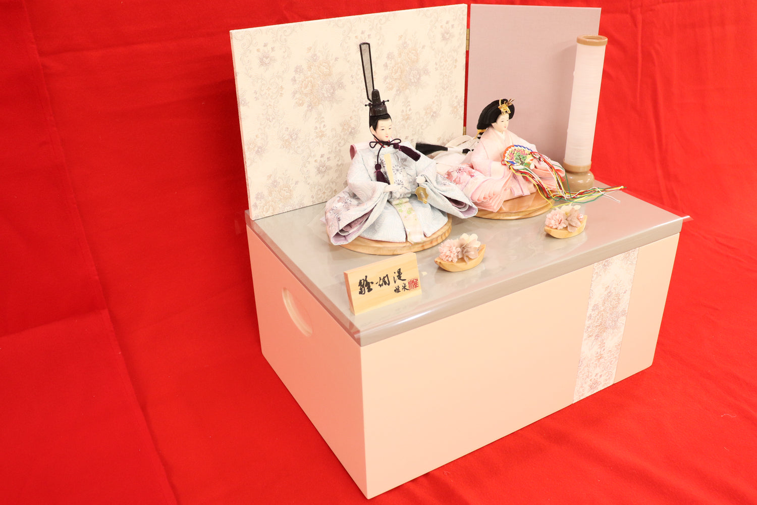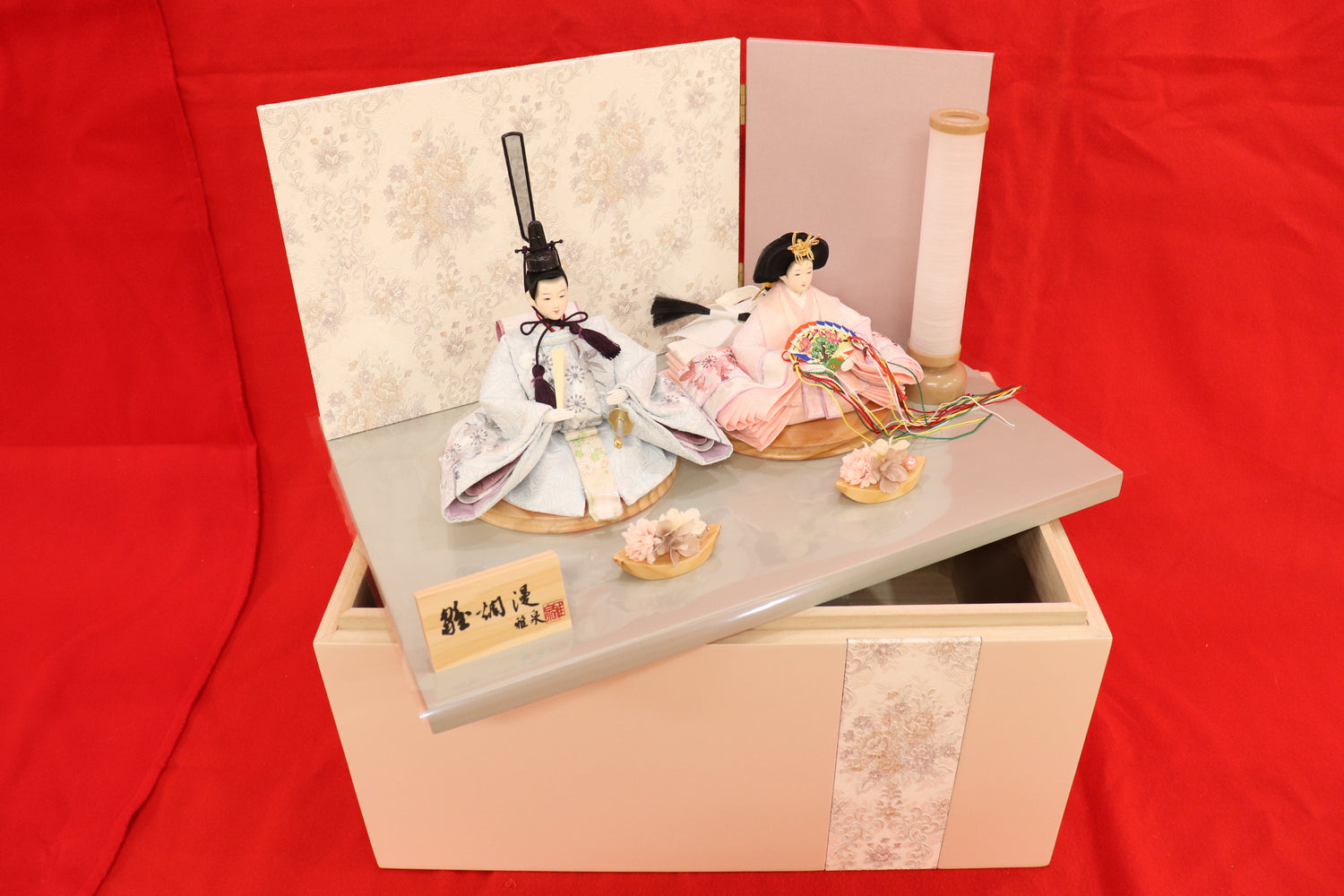 薄いピンク色の飾り箱、淡い衣装の親王様のセットです。