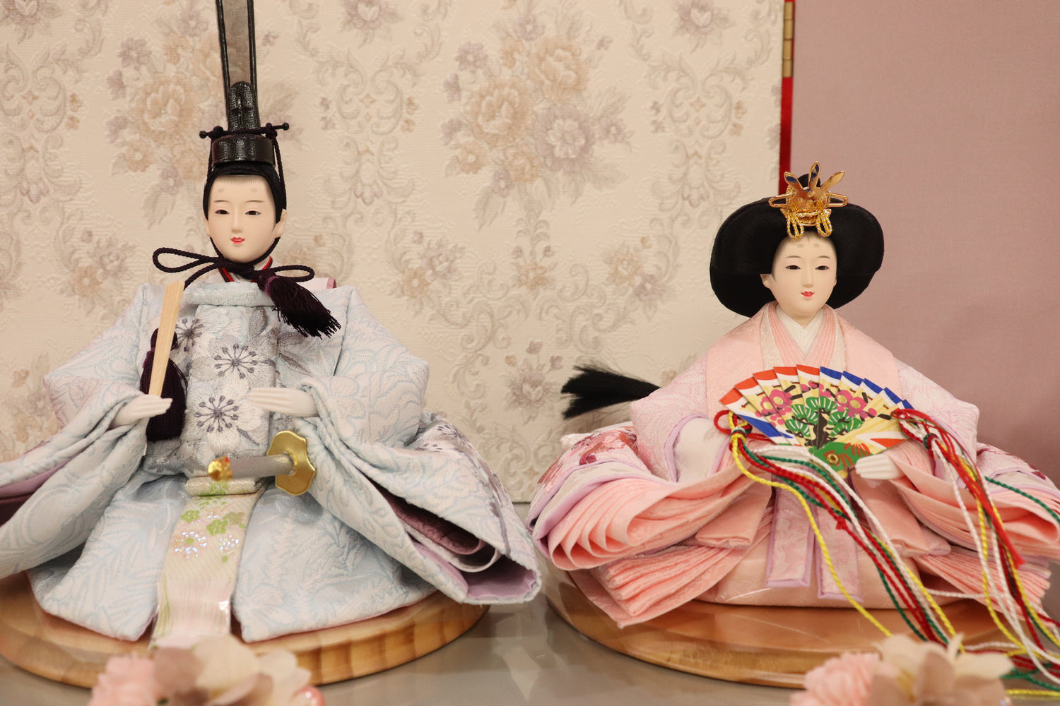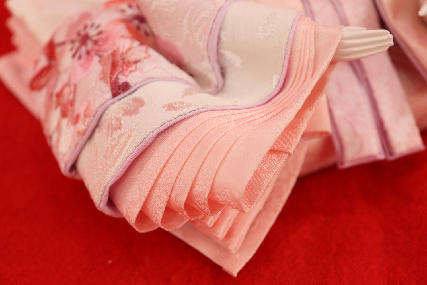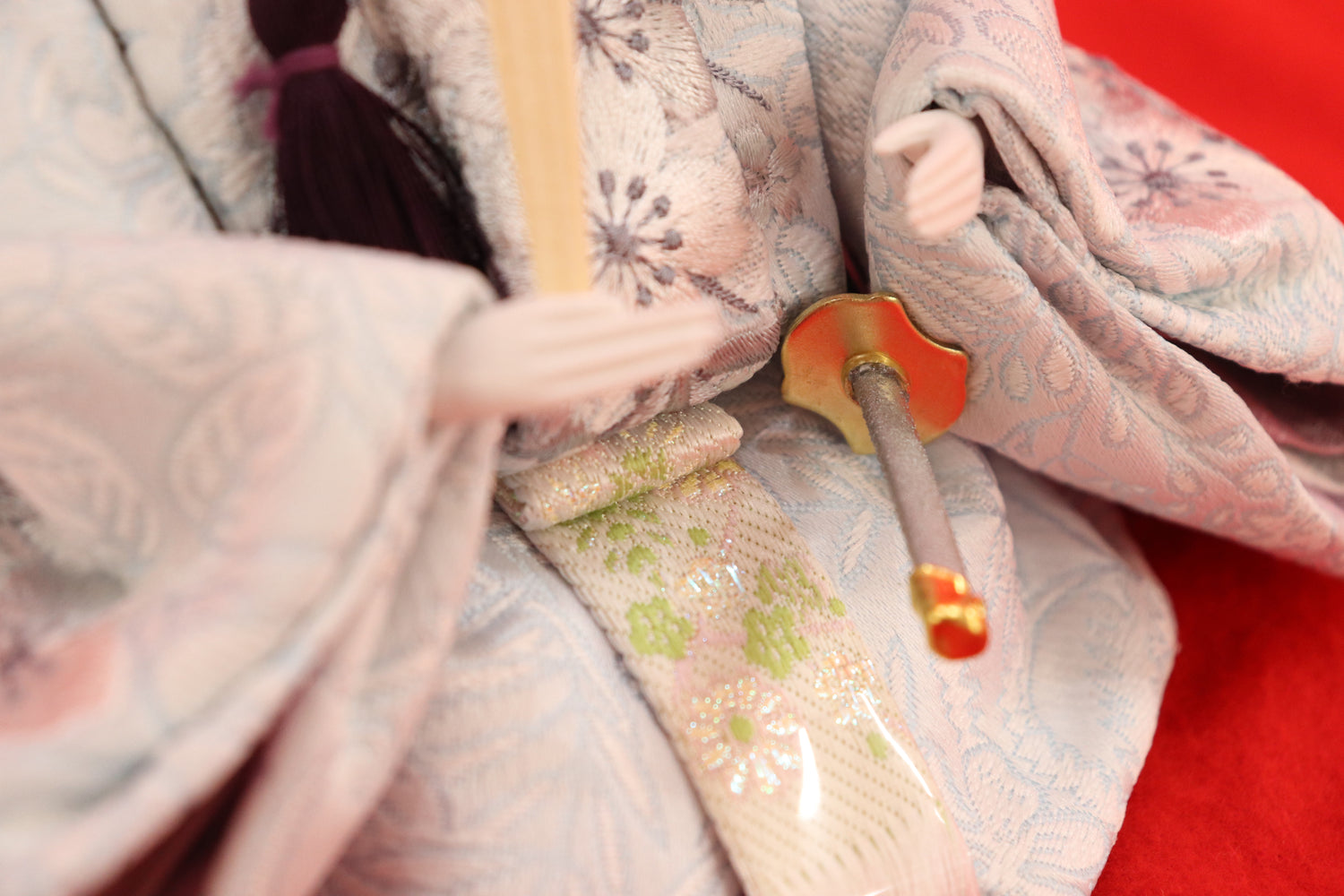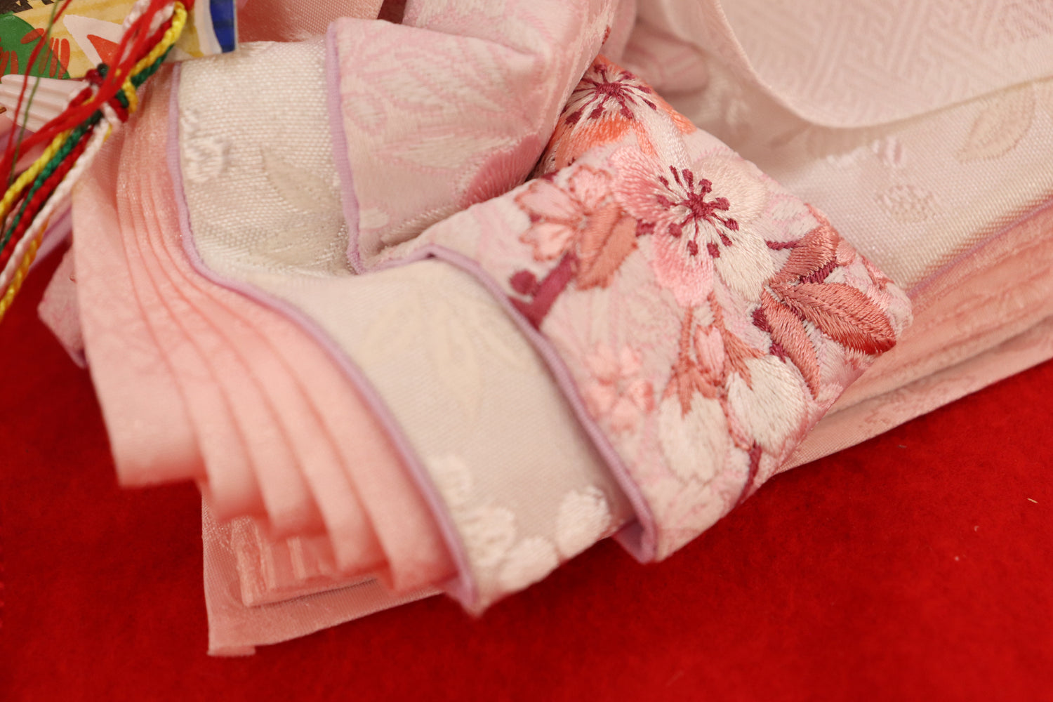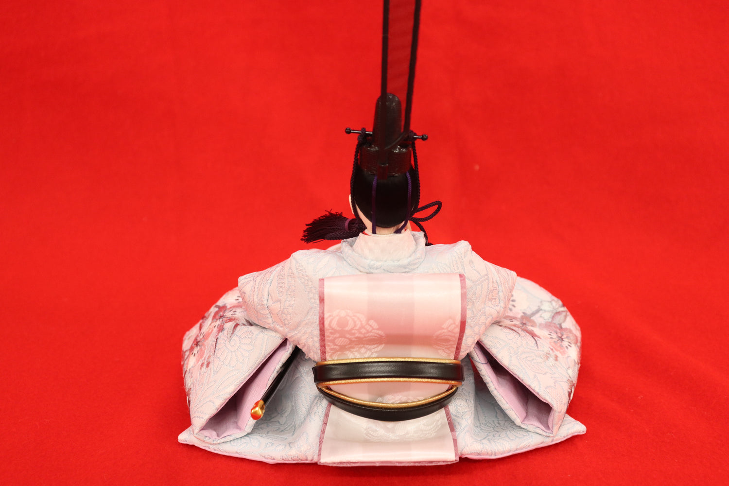 薄いピンク色の飾り箱、淡い衣装の親王様のセットです。