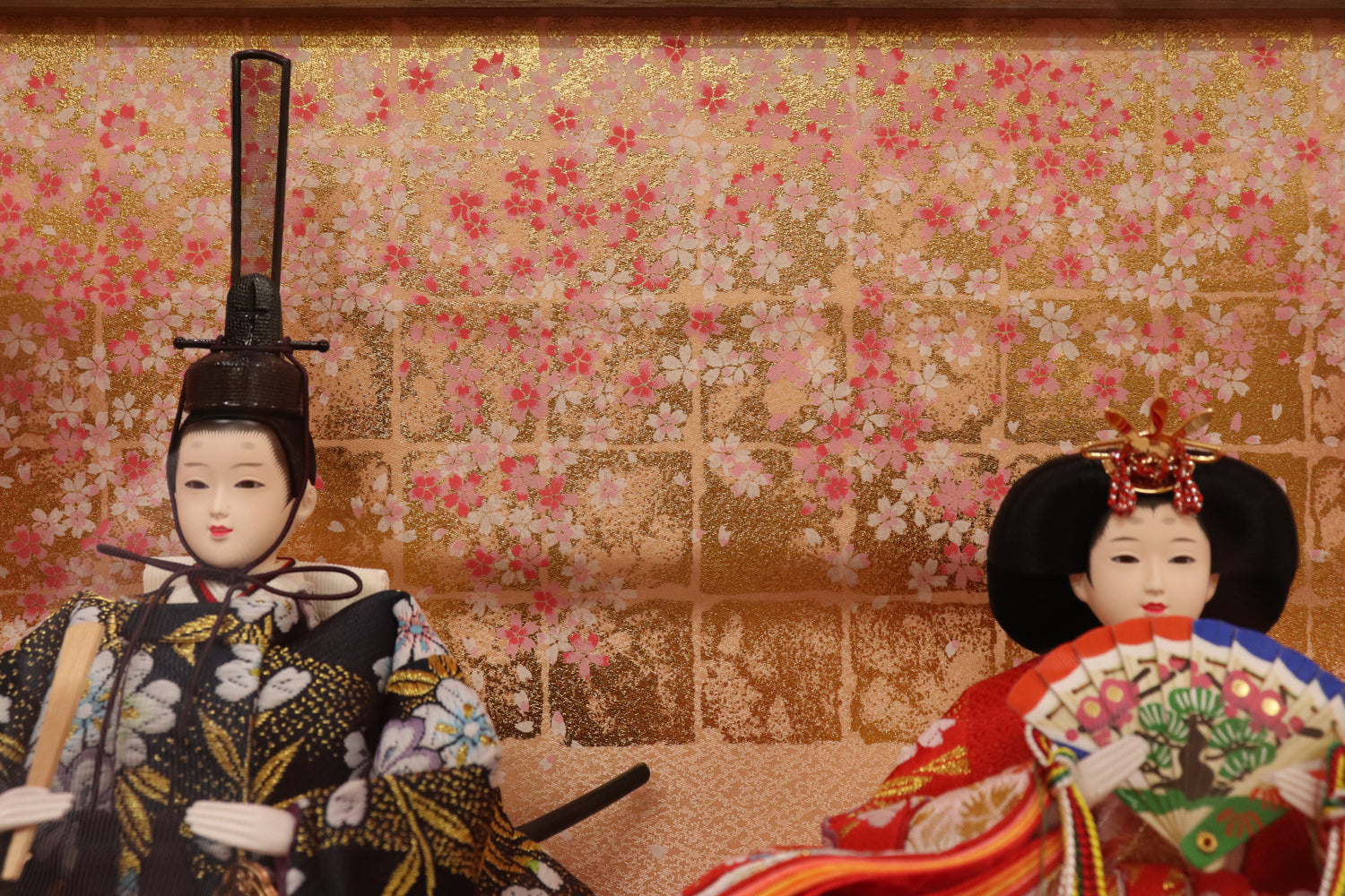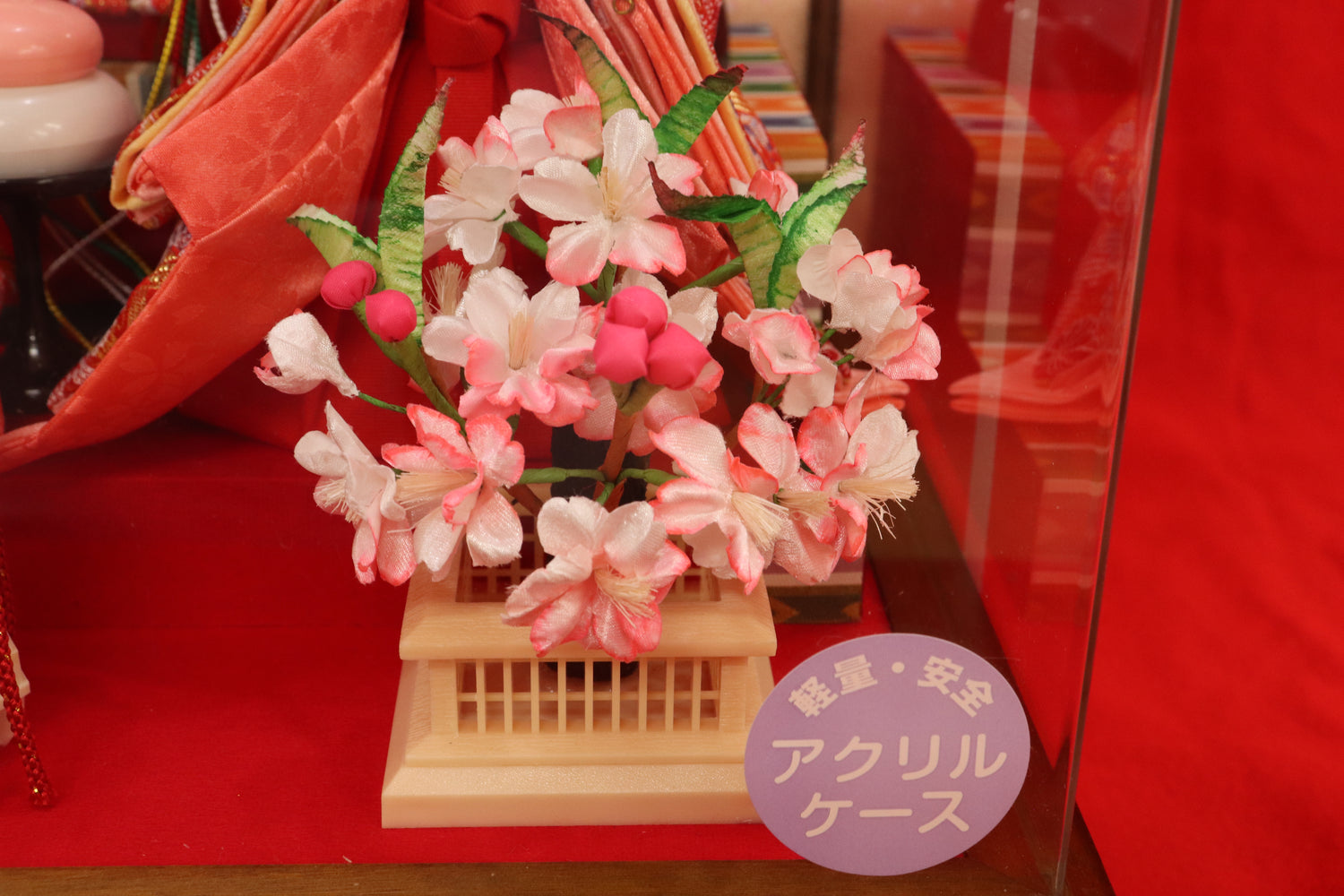 軽量、安全なアクリルケースの親王飾りケースです。木目の枠の中に親王と三人官女が賑やかに揃い、背景の桜模様も明るい雰囲気です。雪洞はコンセント式で点灯します。