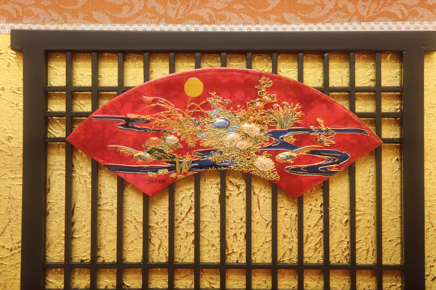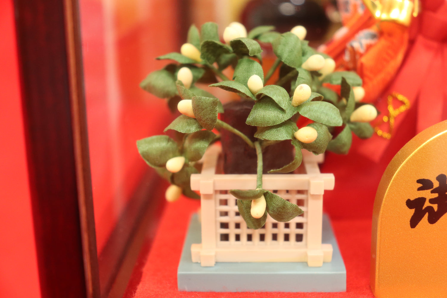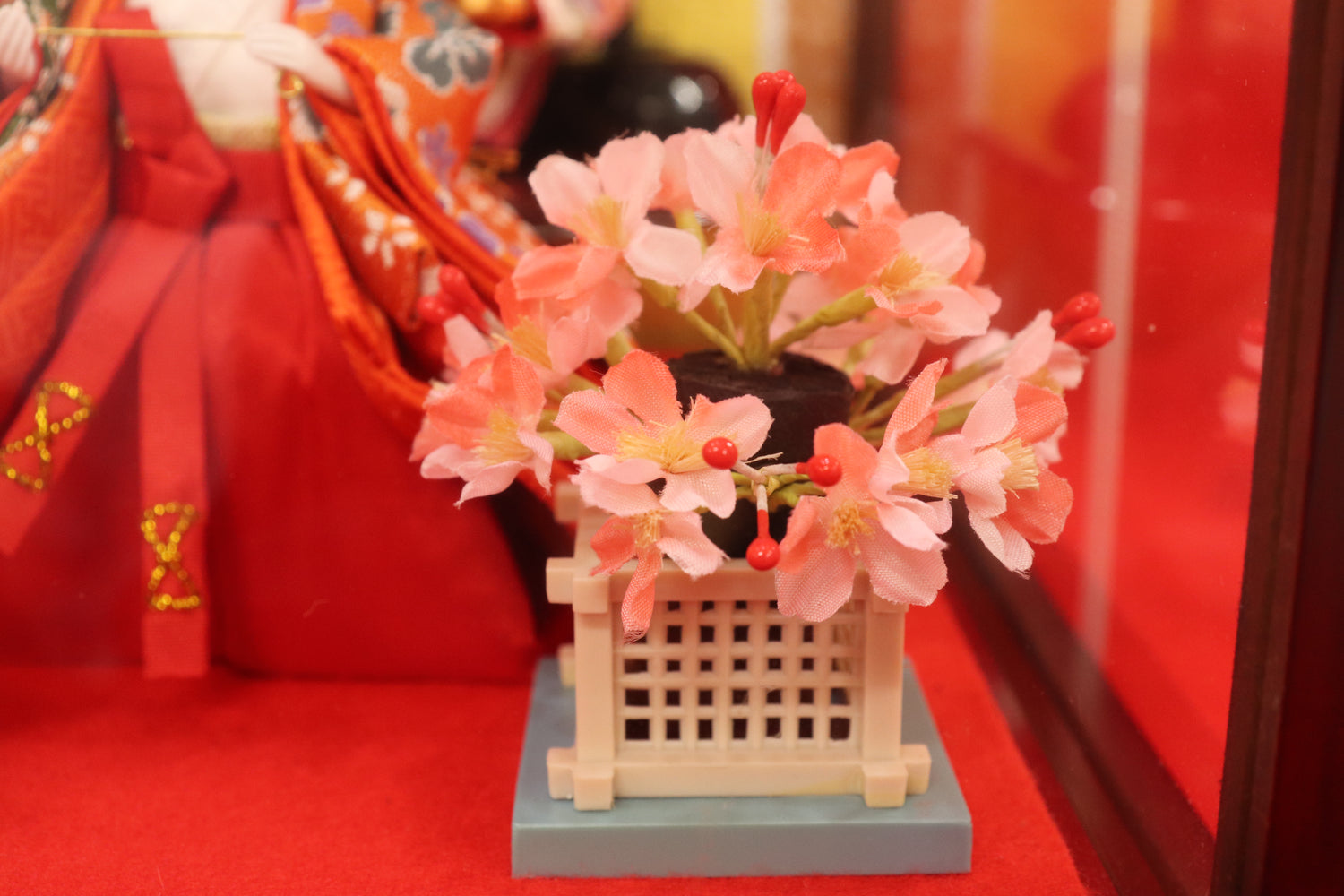 親王、三人官女が揃った賑やかな五人飾りケースセットです。ワインレッドの木枠と背景の金色が調和のとれた雰囲気です。雪洞はコンセント式で点灯します